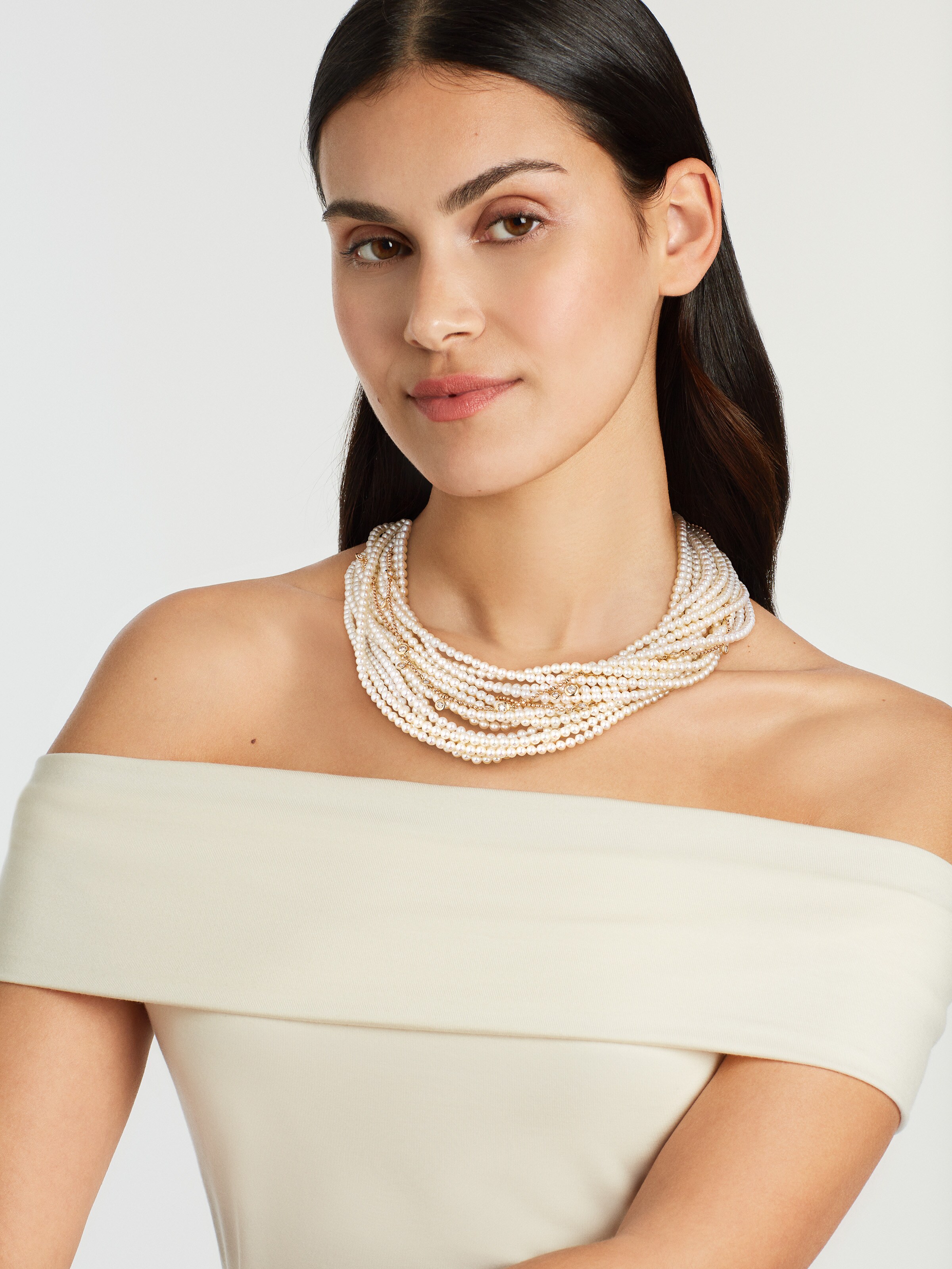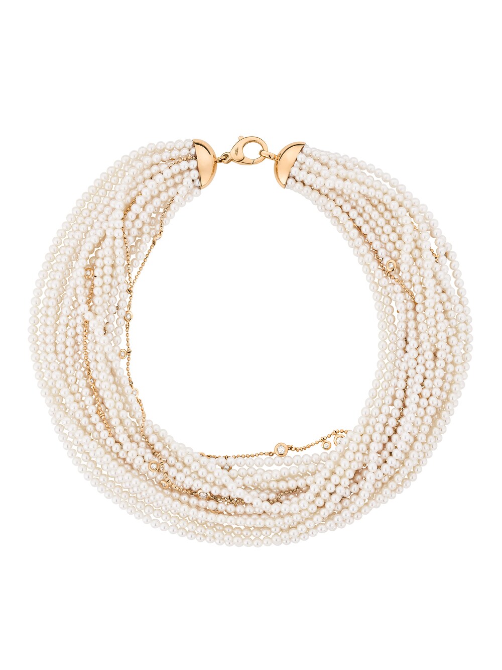 Extravagantes Design, das klassischen Perlenschmuck modern interpretiert. In 17 Reihen legt sich das opulente Perlen-Collier Puntino Pearl BY KIM mit einer Länge von 43 Zentimetern geschmeidig um den Hals. Eingewebt in das schimmernde Weiß der Kaskade von Südsee-Zuchtperlen sind 50 zimtfarbene Brillanten mit 3,16 ct auf einer Kette aus warm strahlendem 18k Roségold. Diese faszinierende Kreation ist ein echter Soloartist und zeigt seine volle Wirkung in Kombination mit schulterfreien Looks.