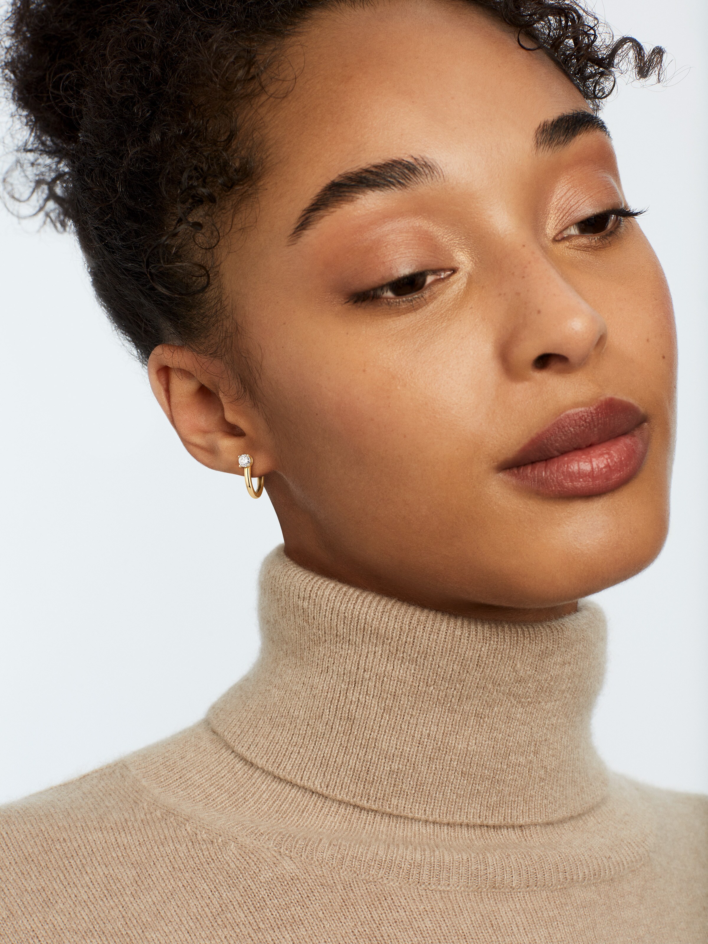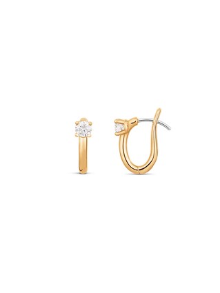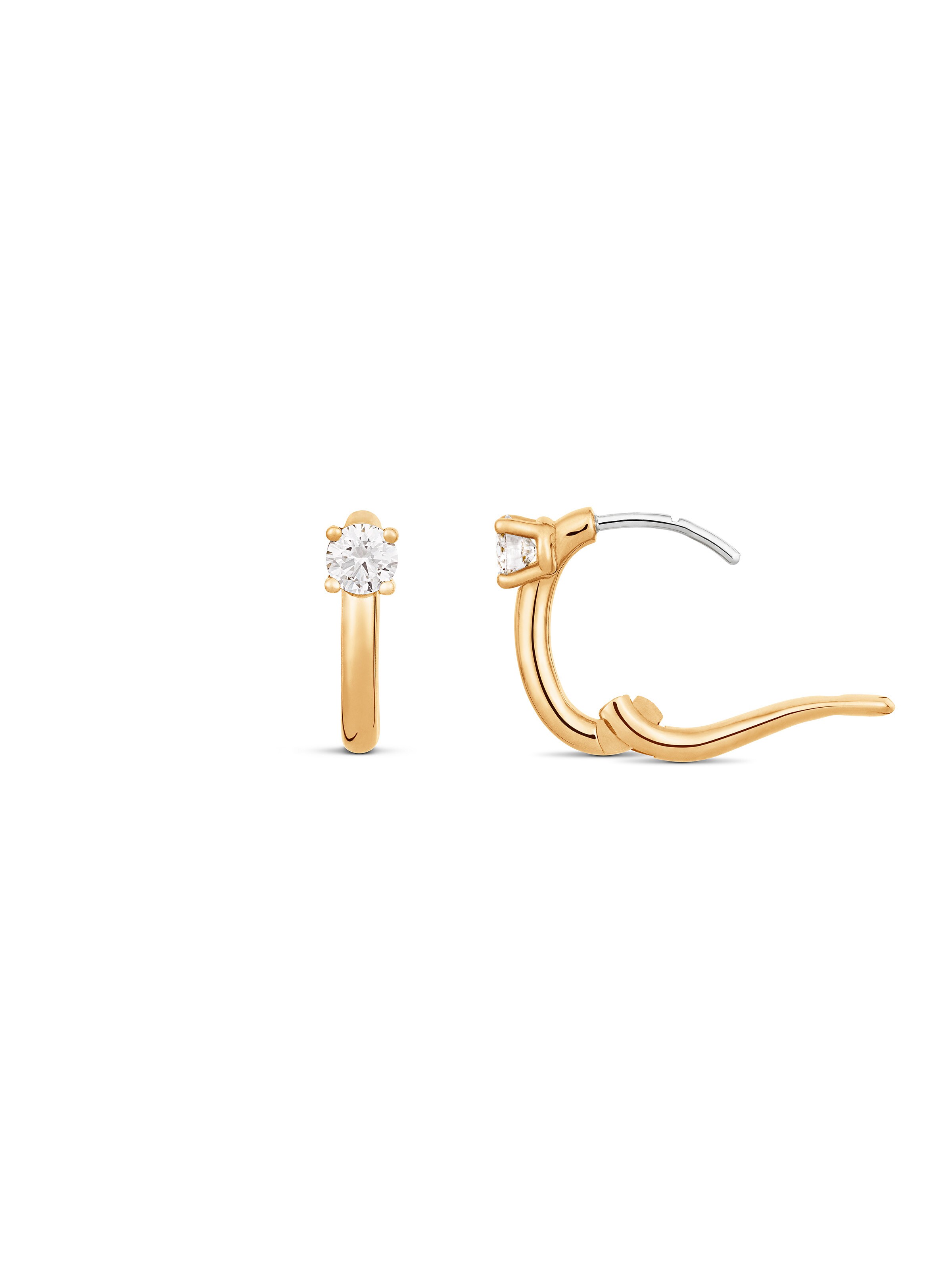 So schlicht und gleichzeitig ein Hingucker. Die Ohrringe One von Fine Jewelry zeichnen sich durch ihren organischen Verlauf und den krappengefassten Brillanten von je 0,25 ct am oberen Ende des Ohrrings aus. Ob mit offenen Haaren oder zur Hochsteckfrisuren kommen die 1,5 Zentimeter großen Kreationen perfekt zur Geltung. Und auch in Sachen Styling sind die Ohrringe aus 18k Gelbgold Alleskönner: Sie passen zu jedem Look – egal ob sportlich, schick oder festlich.