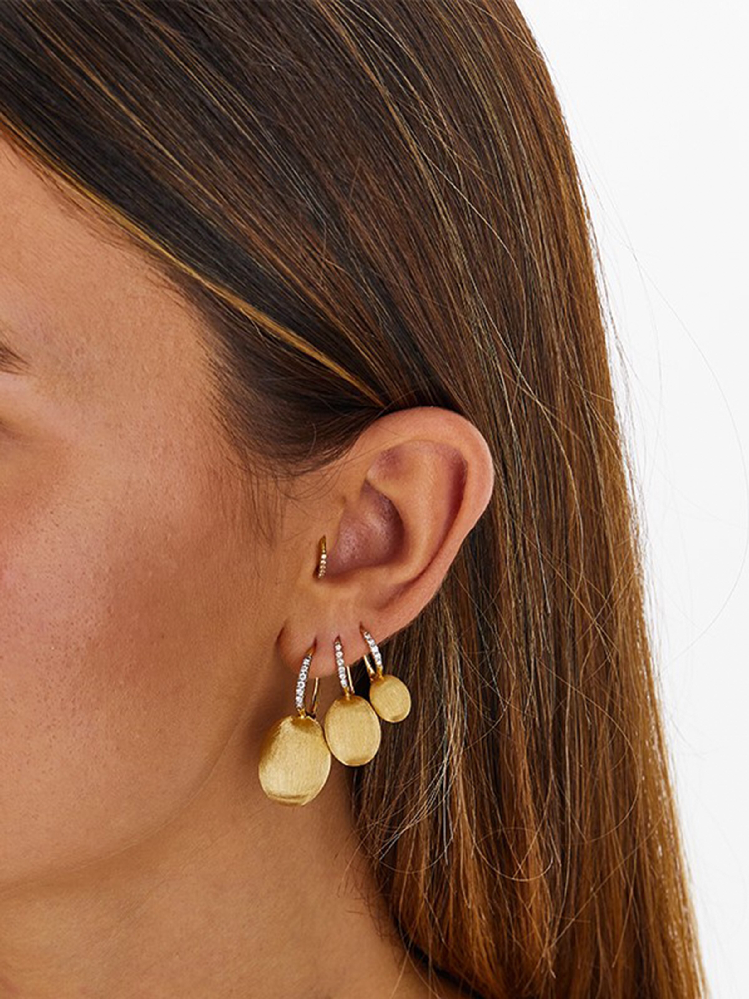 Die Nanis Ciligiene gehören neben den Perlen zu den ikonischen Formen der Schmuckmanufaktur. Sie erinnern an kleine Kirschen und sind handgefertigte Meisterwerke aus 18k Gelbgold. Ein schmales Band aus Brillanten auf jedem Hänger komplettiert die elegante Optik. In verschiedenen Größen und Ausführungen erhältlich, lassen sich die Ohrringe Ciligiene mit weiterem Ohrschmuck stylisch kombinieren.