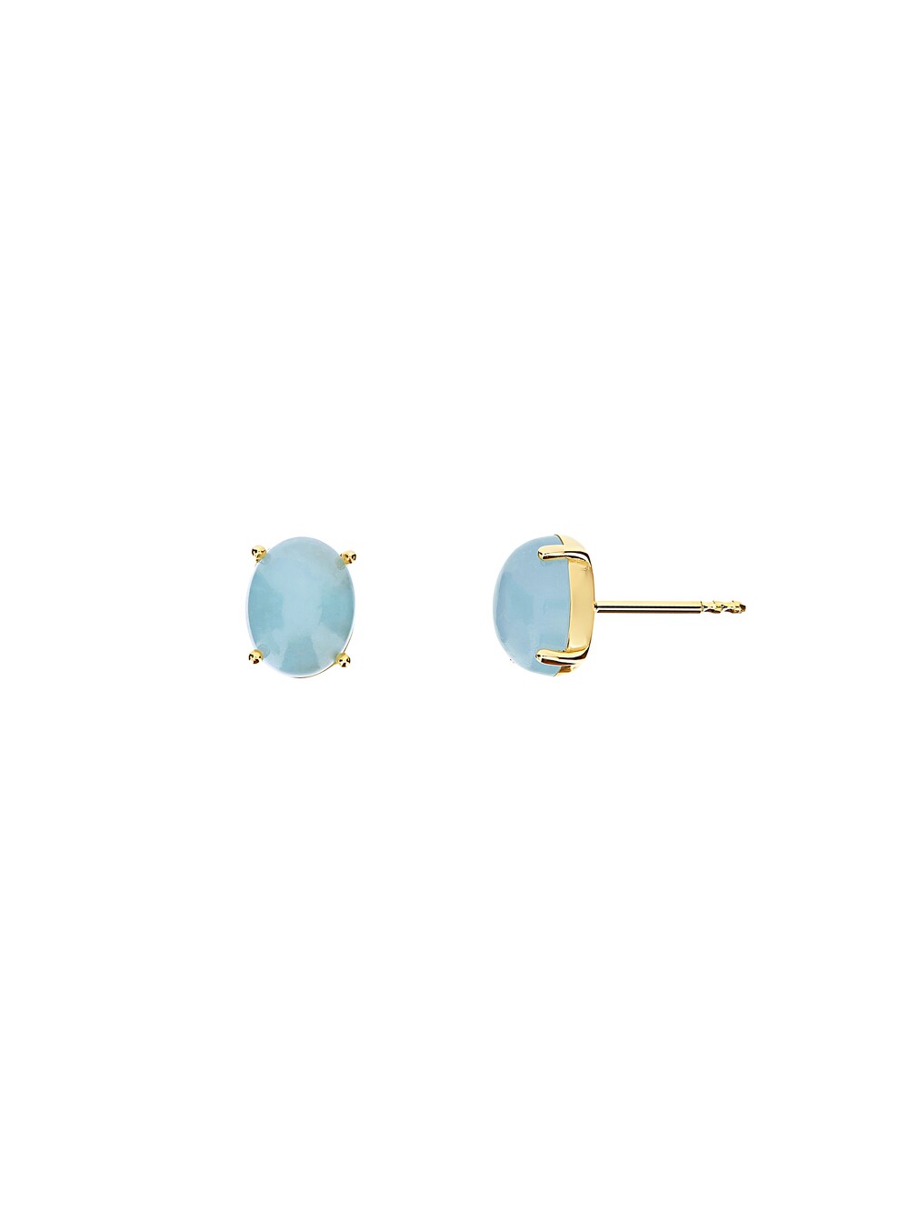 So schlicht die Ohrringe Dancing Azure von Nanis erscheinen, so besonders sind sie. Das Geheimnis der Ohrstecker verbirgt sich in den verwendeten Edelsteinen: Der Milky Aquamarin zeichnet sich durch ein zartes, fast milchiges Blau aus. Im Inneren durchziehen feine Adern den Stein, so dass jeder Aquamarin einzigartig ist. Gehalten werden die beiden Edelsteine im ovalen Cabochon-Schliff durch eine schlichte Fassung aus 18k Gelbgold. Für den optimalen Sitz am Ohr sorgen Stecker mit einer speziellen Lamelle.