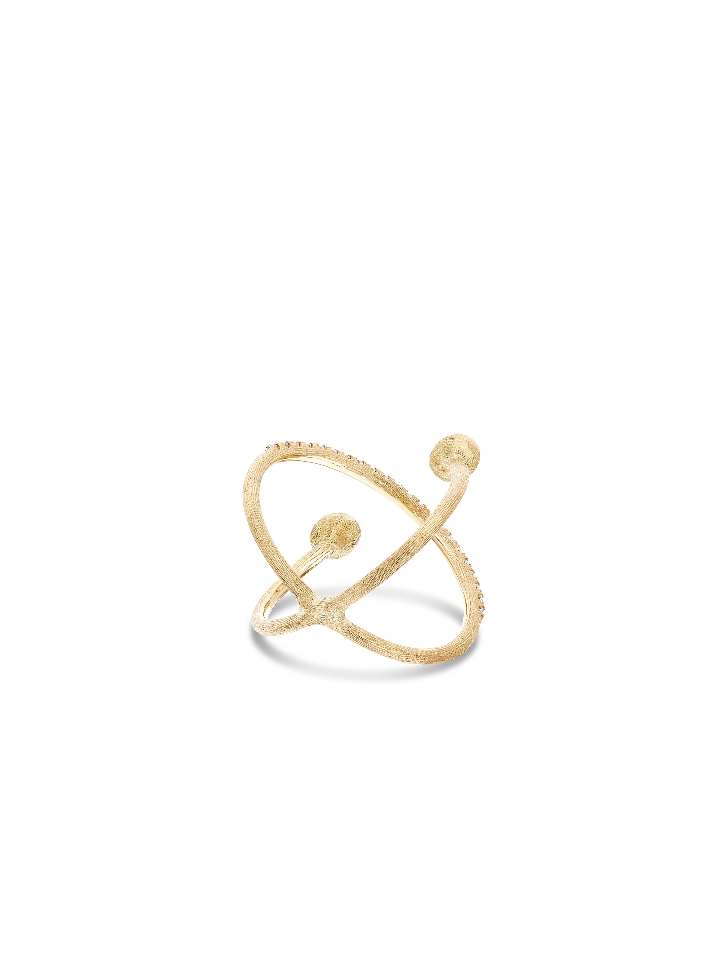 Ein raffiniertes Spiel aus Formen, Materialien und Reflexionen. Der Ring Dancing Élite von Nanis verbindet zwei Ringschienen zu einem ebenso lässigen wie eleganten Schmuckstück. Die eine offen und mit zwei ikonischen Nanis Perlen gekrönt, die andere geschlossen und mit 22 Brillanten besetzt. So entsteht der Eindruck, dass sich Gold und Diamanten verfolgen und dennoch nie erreichen. Eine Hommage an die Unendlichkeit und ein Ring mit besonders hohem Tragekomfort.