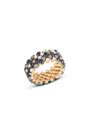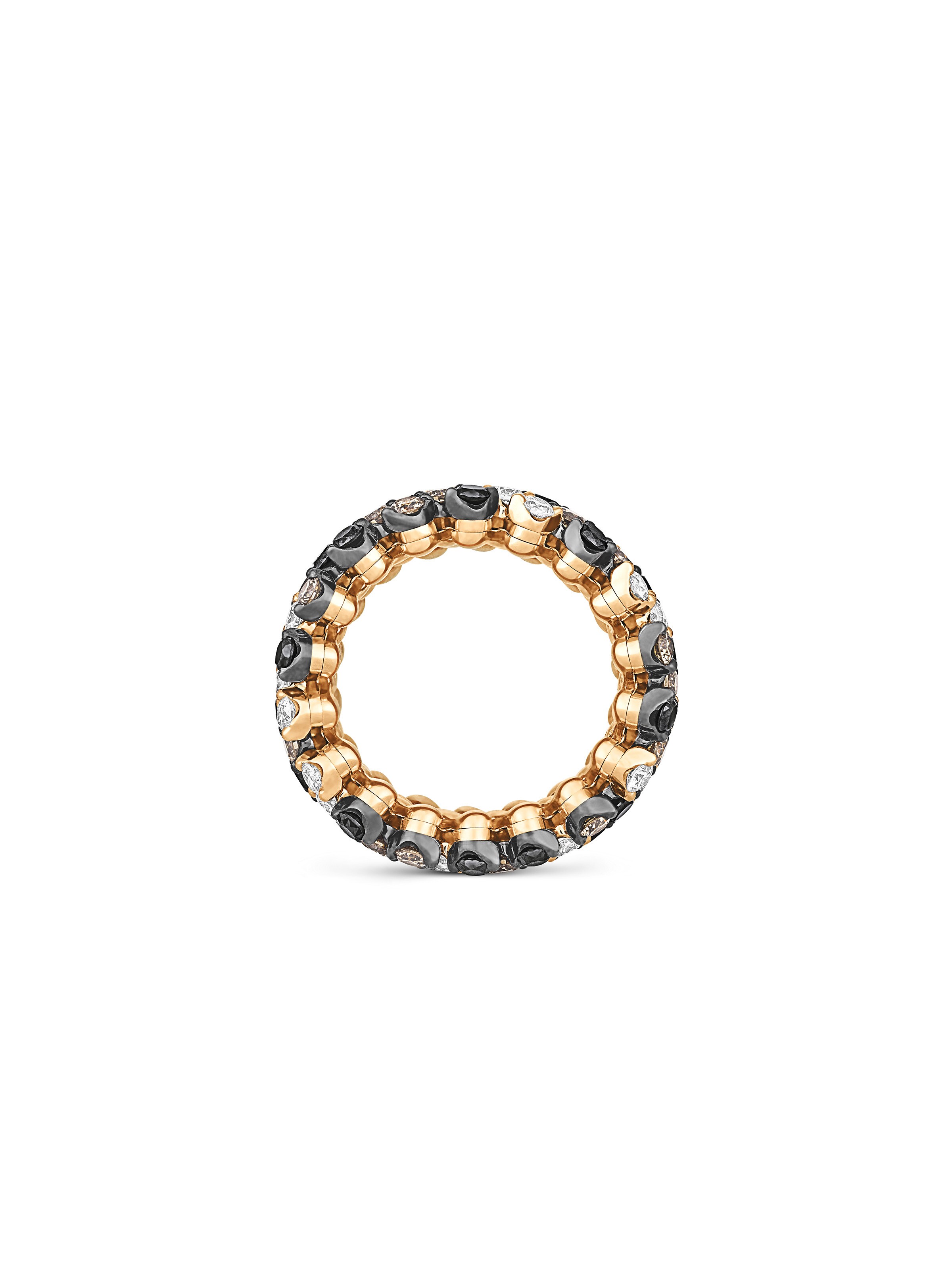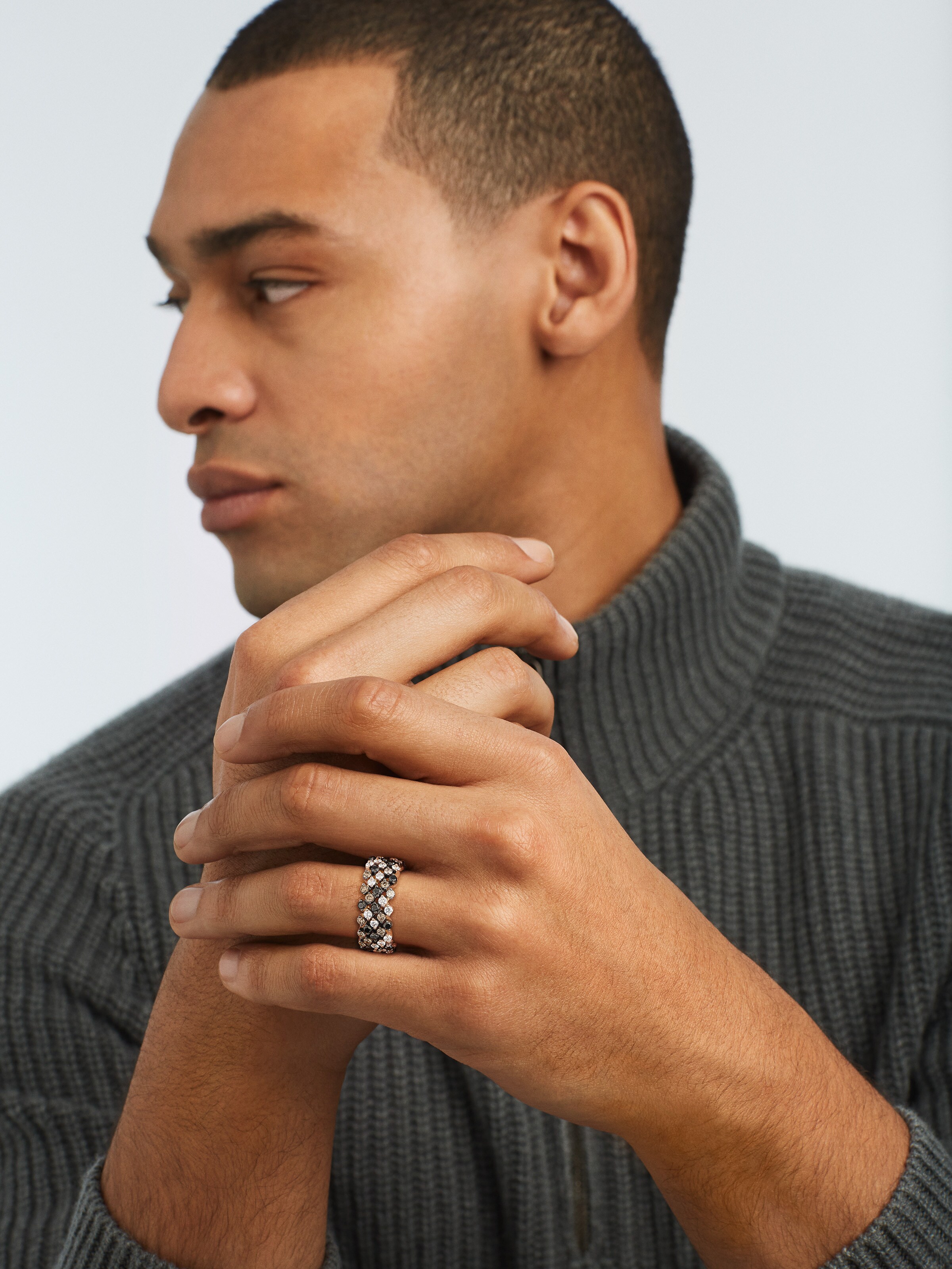 Ob kleiner Finger oder Daumen – dieser Ring macht an jedem Finger eine gute Figur! Durch eine innovative Ringschiene kann der Ring Multisize Serafino Consoli auseinandergezogen oder zusammengeschoben werden und erhält damit eine flexible Ringgröße. Sieben versetzte Reihen aus je 30 braunen, weißen und schwarz behandelten Diamanten in Krappenfassung mit insgesamt 3,50 ct machen den opulenten Ring aus 18k Roségold mit schwarz rhodinierten Fassungen zu einem neuen Lieblingsschmuckstück, das einfach immer passt.
