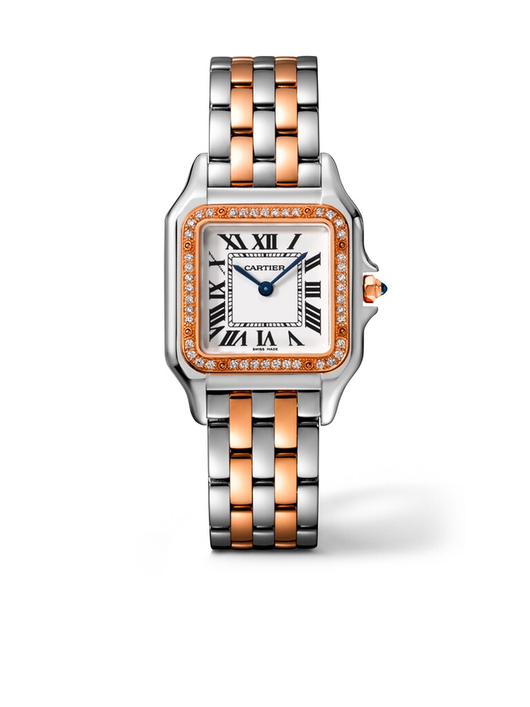 Panthère de Cartier, mittleres Modell, Quarzwerk. Gehäuse aus 750er Roségold und Edelstahl, Lünette mit 44 Diamanten im Brillantschliff von insgesamt 0,28 Karat besetzt. Maße: 29 mm x 37 mm. Höhe: 6 mm. Krone mit einem synthetischen blauen Spinell besetzt, silberfarbenes Zifferblatt, gebläute Zeiger in Schwertform, Armband aus 750er Roségold und Edelstahl. Wasserdicht bis zu 3 bar.