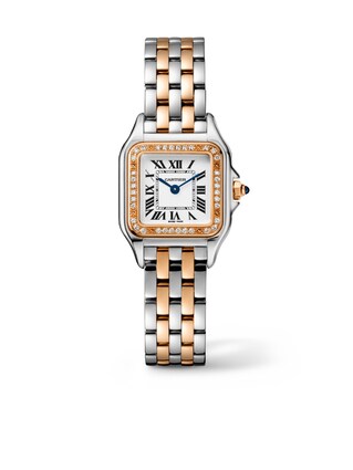 Panthère de Cartier, kleines Modell, Quarzwerk. Gehäuse aus 750er Roségold und Edelstahl, Lünette mit 36 Diamanten im Brillantschliff von insgesamt 0,24 Karat besetzt. Maße: 22 mm x 30 mm. Höhe: 6 mm. Krone mit einem synthetischen blauen Spinell besetzt, silberfarbenes Zifferblatt, gebläute Zeiger in Schwertform, Armband aus 750er Roségold und Edelstahl. Wasserdicht bis zu 3 bar.