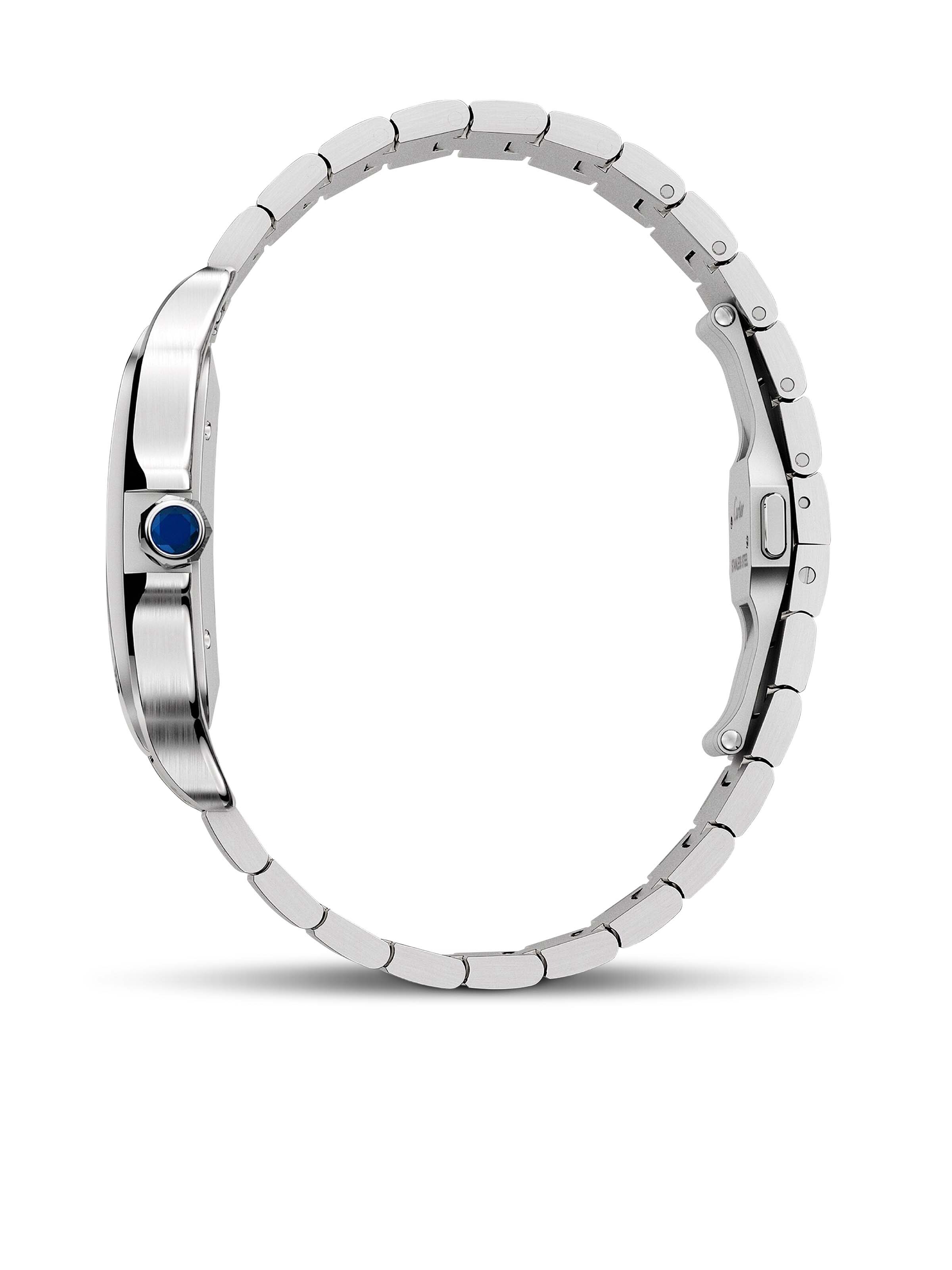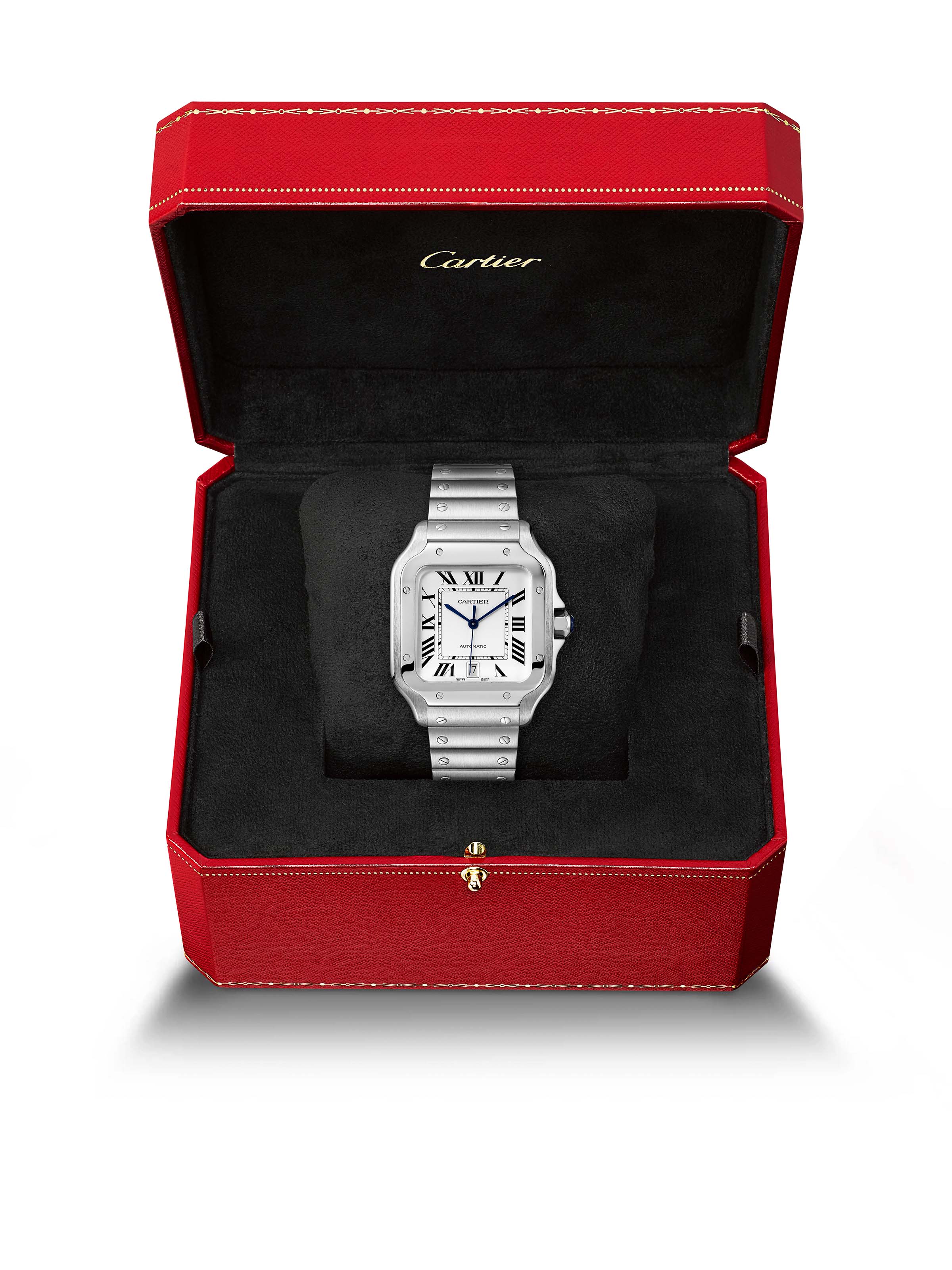 Santos, großes Modell, mechanisches Uhrwerk mit Automatikaufzug, Kaliber 1847 MC. Gehäuse aus Edelstahl, Mehrkantaufzugskrone mit einem facettierten synthetischen Spinell besetzt, silberfarbenes Opalin-Zifferblatt, schwertförmige Zeiger aus gebläutem Stahl, Saphirglas. Armband aus Edelstahl mit SmartLink-System zur Längenanpassung. Zweites Armband aus Kalbsleder mit austauschbarer Doppeltfaltschließe aus Stahl. Beide Armbänder sind mit dem QuickSwitch-Armbandwechselsystem ausgestattet. Gehäusebreite: 39,8 mm. Höhe: 9,38 mm. Wasserdicht bis 10 bar.