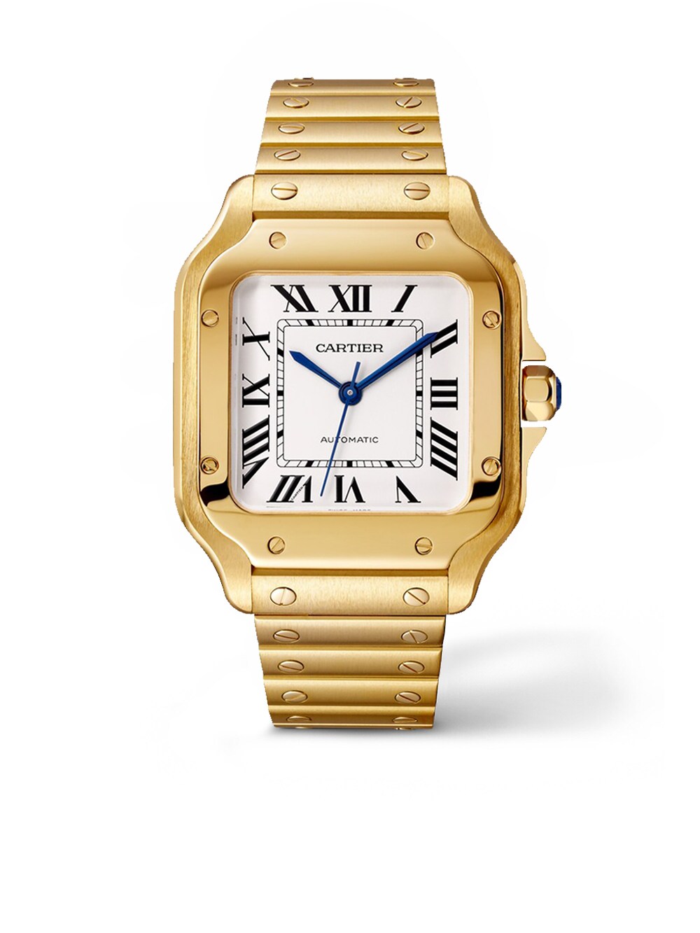 Santos, mittleres Modell, mechanisches Uhrwerk mit Automatikaufzug, Kaliber 1847 MC. Gehäuse aus 750er Gelbgold, Mehrkantaufzugskrone aus 750er Gelbgold mit einem facettierten Saphir besetzt, silberfarbenes Opalin-Zifferblatt, schwertförmige Zeiger aus gebläutem Stahl, Saphirglas. Armband aus 750er Gelbgold mit SmartLink-System zur Längenanpassung. Zweites Armband aus Alligatorleder, austauschbare Doppeltfaltschließe aus 750er Gelbgold. Beide Armbänder sind mit dem QuickSwitch-Armbandwechselsystem ausgestattet. Gehäusebreite: 35,1 mm. Höhe: 8,83 mm. Wasserdicht bis 10 bar.