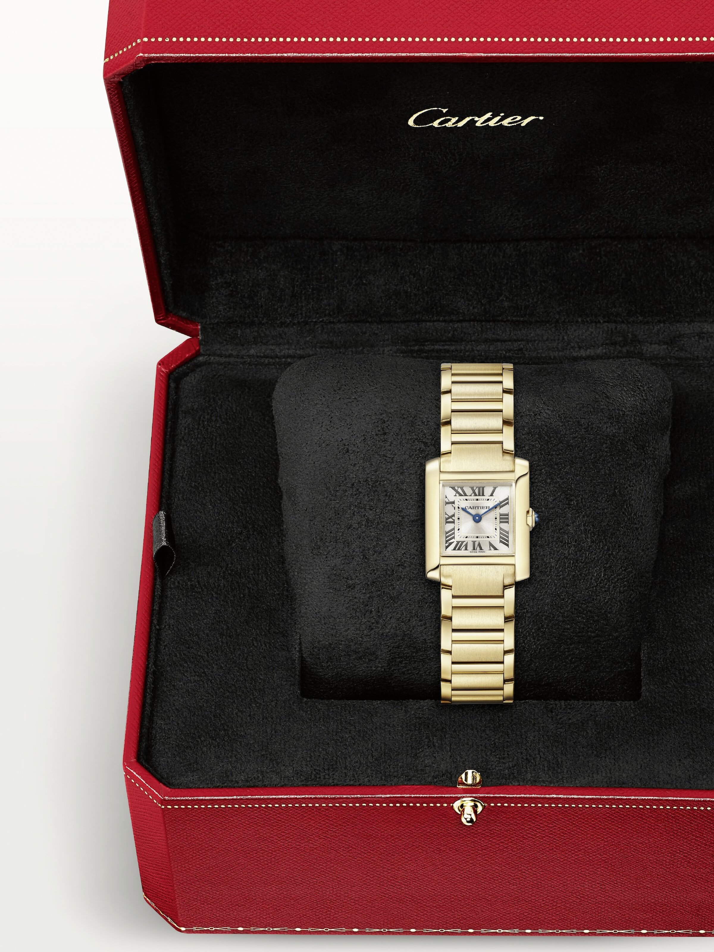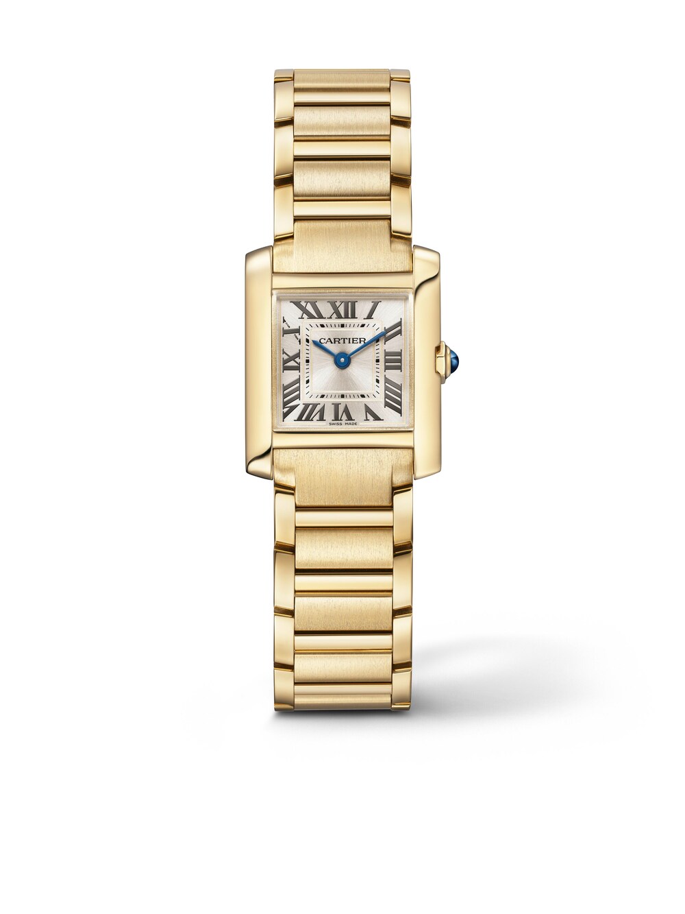 Tank Française, kleines Modell, Quarzwerk. Gehäuse aus 750er Gelbgold. Mehrkantaufzugskrone aus 750er Gelbgold mit einem Saphircabochon besetzt. Zifferblatt in Gold mit Sonnenschliff, schwertförmige Zeiger aus gebläutem Edelstahl, Saphirglas. Armband aus 750er Gelbgold. Maße: 25,7 mm x 21,2 mm. Höhe: 6,8 mm. Wasserdicht bis zu 3 bar.
