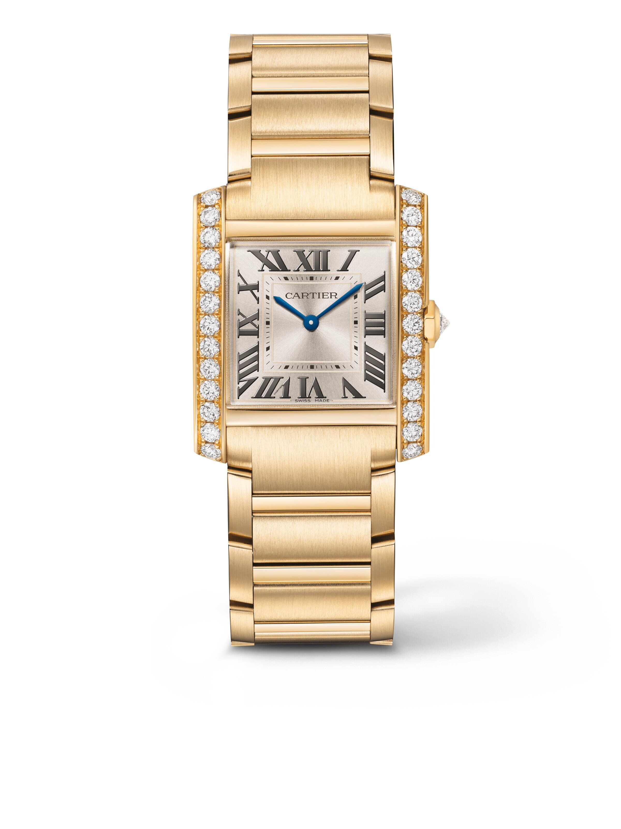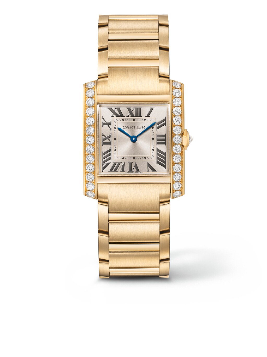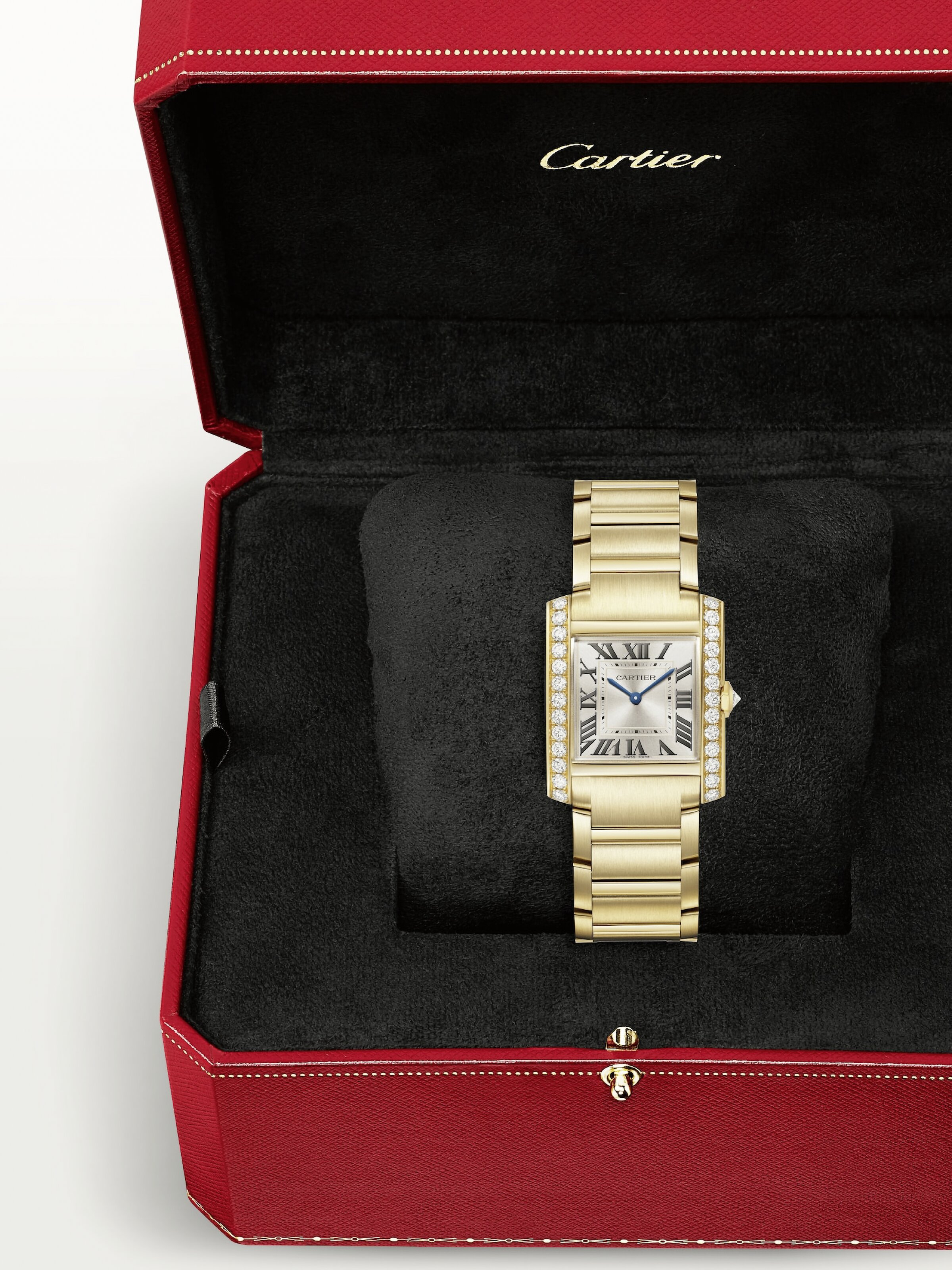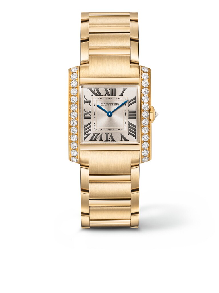 Tank Française, mittleres Modell, Quarzwerk. Gehäuse und Mehrkantaufzugskrone aus 750er Gelbgold mit 27 Diamanten im Brillantschliff von insgesamt 1,22 Karat besetzt. Zifferblatt in Gold mit Sonnenschliff, schwertförmige Zeiger aus gebläutem Edelstahl, Saphirglas. Armband aus 750er Gelbgold. Gehäuseabmessungen: 32 mm x 27 mm. Höhe: 7,1 mm. Wasserdicht bis zu 3 bar.
