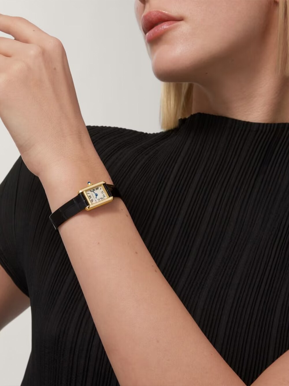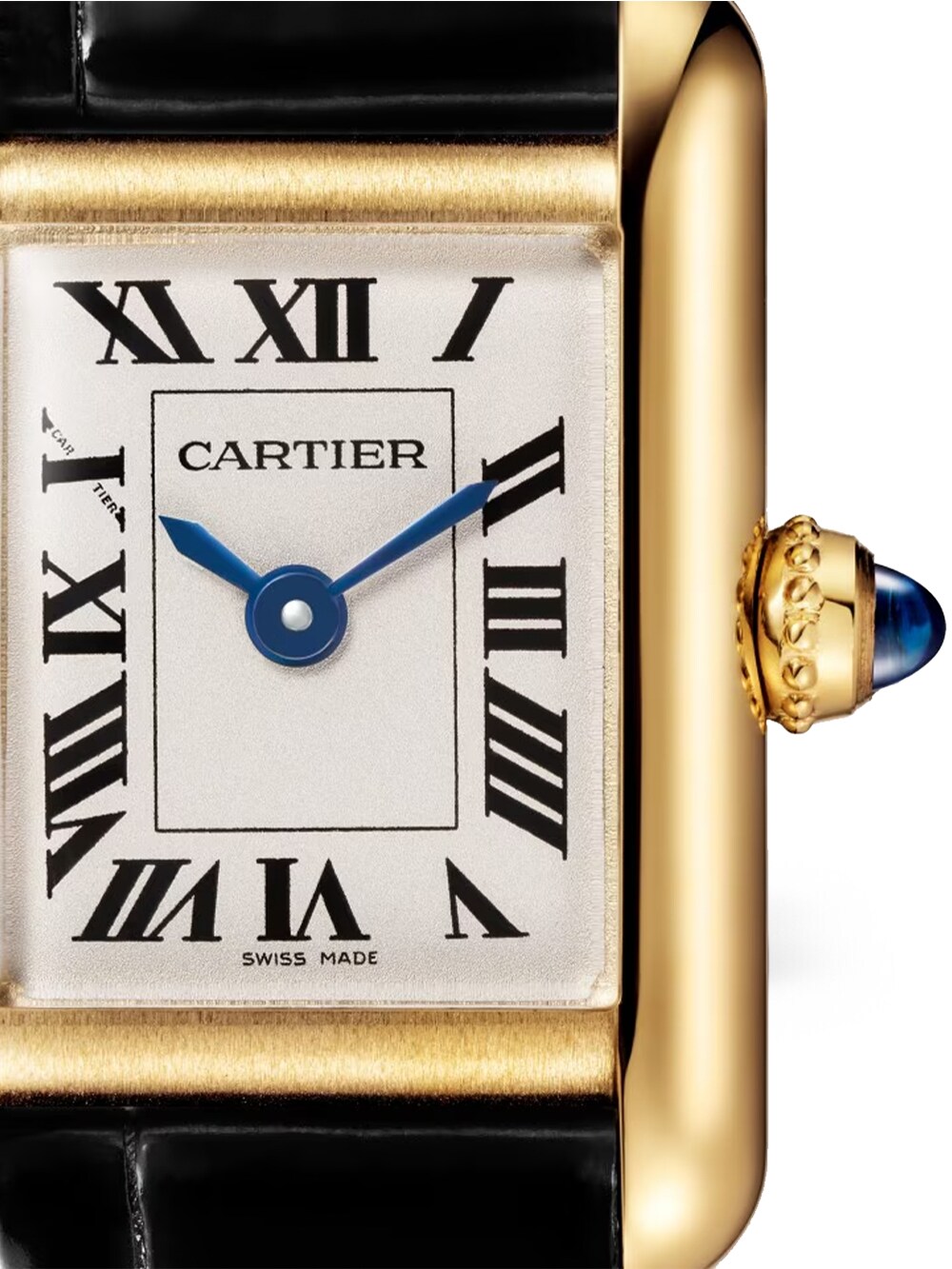 Tank Louis Cartier, Mini-Modell, Quarzwerk. Gehäuse aus 750er Gelbgold, perlierte Krone mit einem Saphir besetzt, gekörntes Zifferblatt in Silber, schwertförmige Zeiger aus gebläutem Stahl, Mineralglas, Armband aus glänzendem schwarzem Alligatorleder, Stiftschließe aus 750er Gelbgold. Gehäuseabmessungen: 24 mm x 16,5 mm. Höhe: 6,2 mm. Wasserdicht bis zu 3 bar.