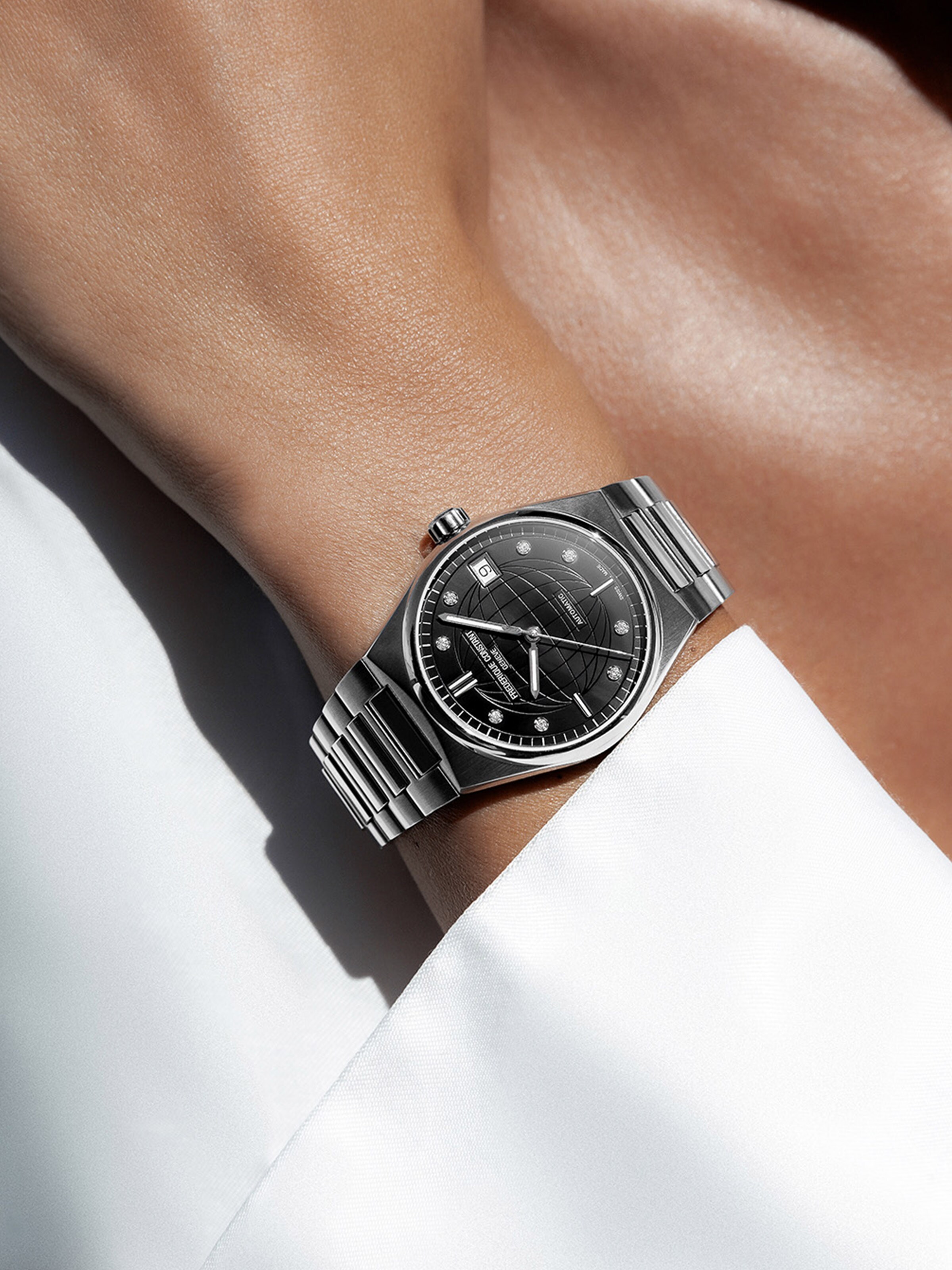 Die femininen Modelle der Highlife-Kollektion von Frederique setzen ganz auf ein zeitloses Design: Auf dem schwarzen Zifferblatt der Highlife Ladies Automatic (Ref. FC-303BD2NH6B) mit Globusdekoration funkeln neben den praktischen Leuchtzeigern und der Datumsanzeige auf 3 Uhr acht Diamanten als Indizes. Die Automatikuhr mit Manufakturkaliber FC-303 und einer Gangreserve von 38 Stunden präsentiert ihr Edelstahlgehäuse mit transparentem Saphirglasboden in einem Durchmesser von 34 Millimetern und ist damit auch an schmalen Handgelenken angenehm zu tragen. Das zusätzliche khakifarbene Kautschukarmband lässt sich besonders einfach wechseln.