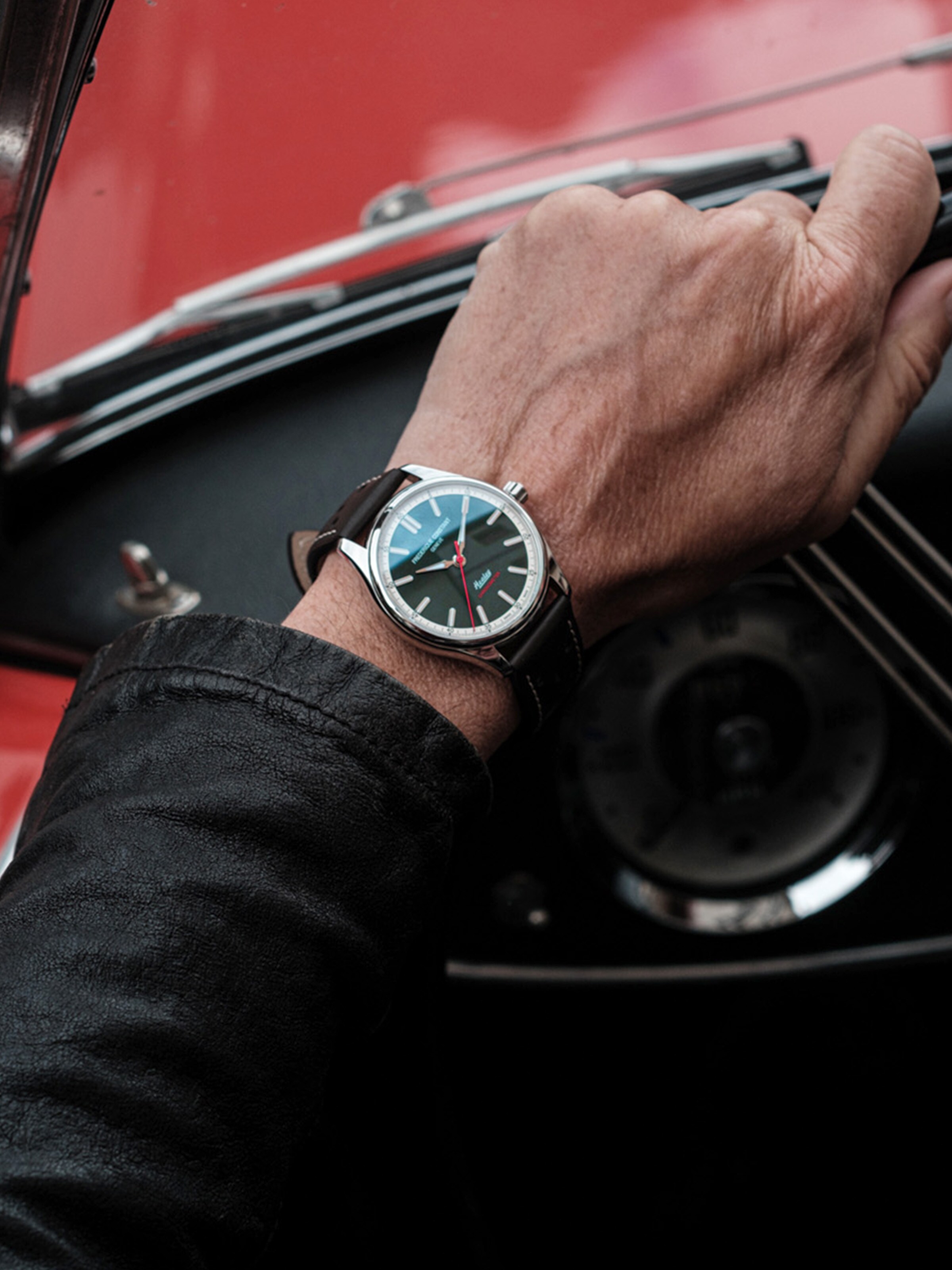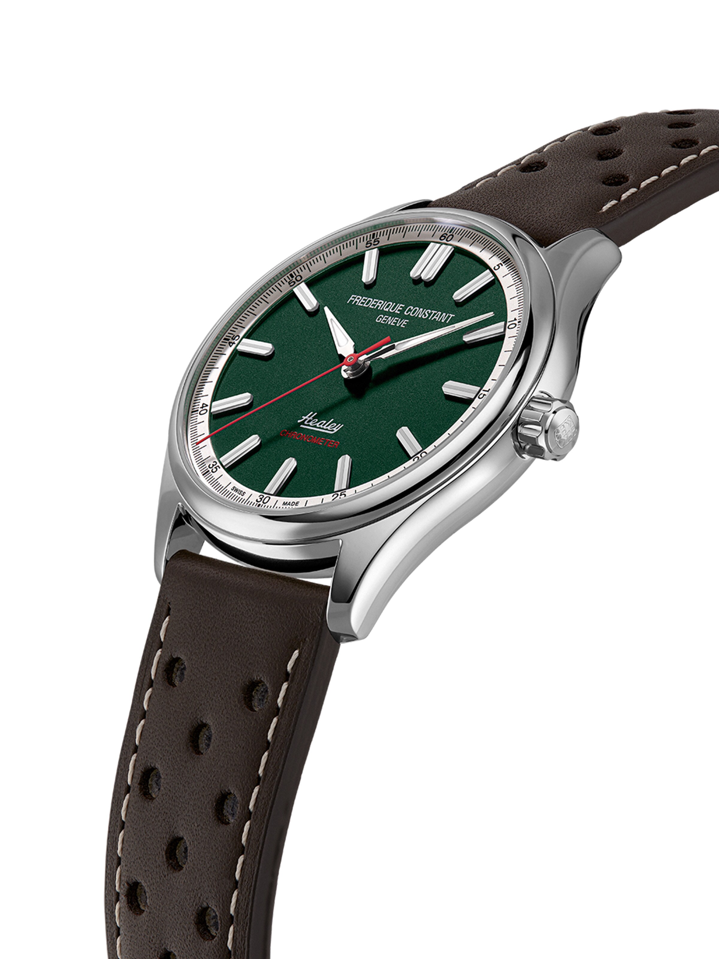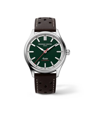Die Frederique Constant Healey, mit der Referenz FC-301HGRS5B6, ist eine Hommage an die Eleganz und das sportliche Erbe klassischer Automobile. Limitiert auf nur 1.888 Exemplare weltweit, verkörpert sie Exklusivität und Leidenschaft für feinste Uhrmacherkunst. Mit einem Durchmesser von 40 Millimetern und einem Gehäuse aus Edelstahl schmiegt sie sich perfekt an das Handgelenk. Das Automatikwerk FC-301, welches im Herzen dieser Uhr schlägt, bietet eine Gangreserve von 38 Stunden und ist mit einer Datumsfunktion ausgestattet. Das grüne Zifferblatt setzt einen markanten Akzent und wird durch ein Armband aus braunem Kalb ergänzt, das Stil und Komfort in perfekter Harmonie vereint. Wasserdicht bis zu 5 bar, ist sie ein zuverlässiger Zeitmesser für jeden Anlass. Die Stiftschließe rundet das Design ab und sorgt für eine sichere Passform. Mit Indizes und einer Zentralsekunde ausgestattet, ist die Healey ein Symbol für zeitlose Ästhetik und technische Präzision.