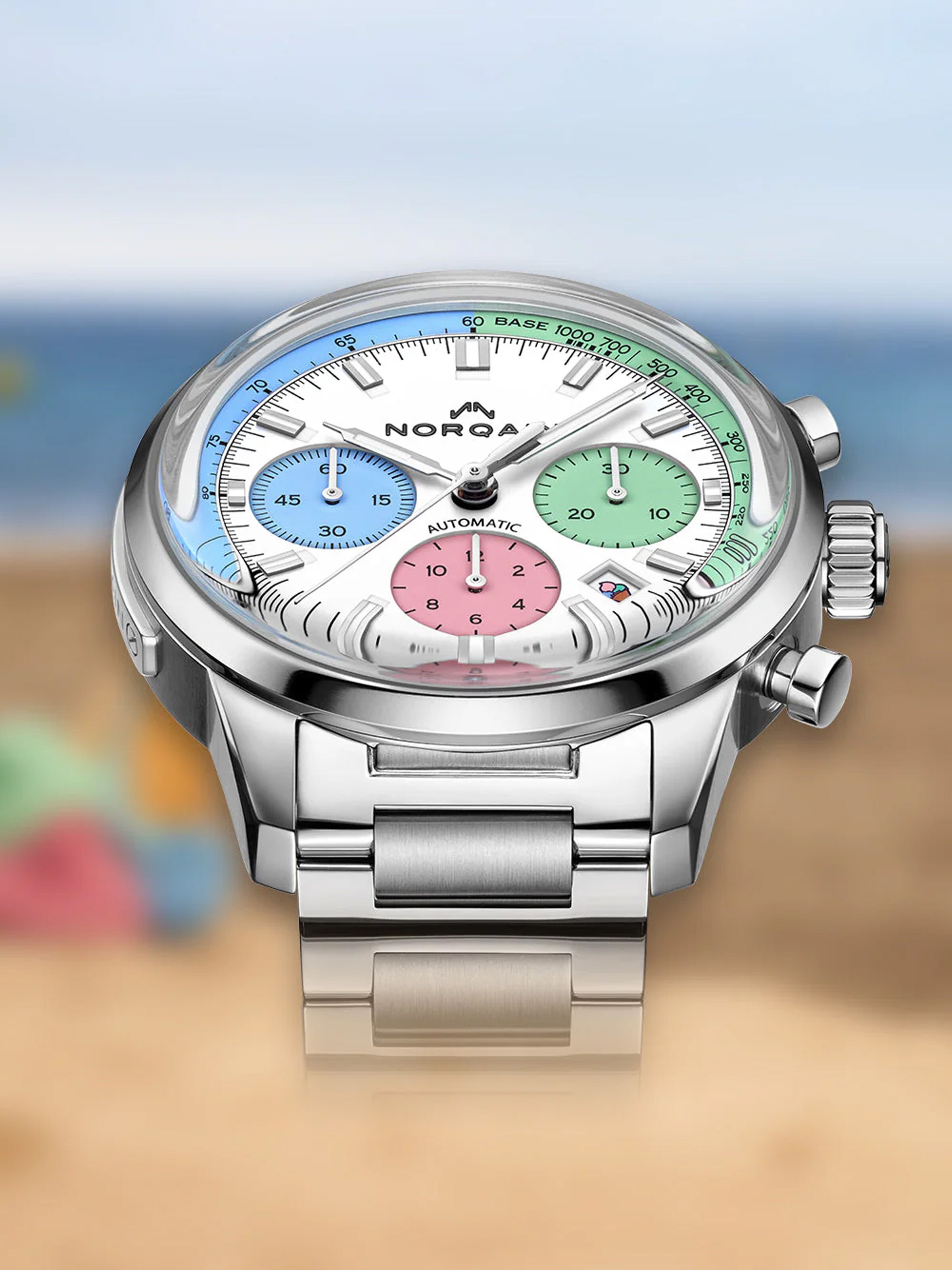 Die Freedom 60 von Norqain ist eine Uhr, welche die Grenzen zwischen klassischem Design und spielerischen Elementen gekonnt verwischt. Mit einem Durchmesser von 40 Millimetern und einem Gehäuse sowie Armband aus Edelstahl, verkörpert sie eine zeitlose Eleganz, die sowohl Damen als auch Herren anspricht. Das weiße Zifferblatt, belebt durch rosa, grüne und blaue Akzente, bringt eine frische Brise in die traditionelle Uhrenwelt. Besonders originell ist die Datumsanzeige, bei welcher teilweise eine Zahl durch eine Eiswaffel mit drei Kugeln ersetzt wird - ein Detail, das Lebensfreude ausstrahlt. Unter dem Saphirglas tickt das NN19 Kaliber, basierend auf dem Sellita SW510a, welches eine beeindruckende Gangreserve von 62 Stunden bietet. Neben der Chronographen- und Tachymeterfunktion ist diese Uhr bis zu 10 bar wasserdicht und somit für jedes Abenteuer gerüstet. Die "Enjoy Life Special" Edition unterstreicht diesen Anspruch und wird mit einer Sonnenbrille sowie einer speziellen Box geliefert, die das Gesamtpaket abrundet.