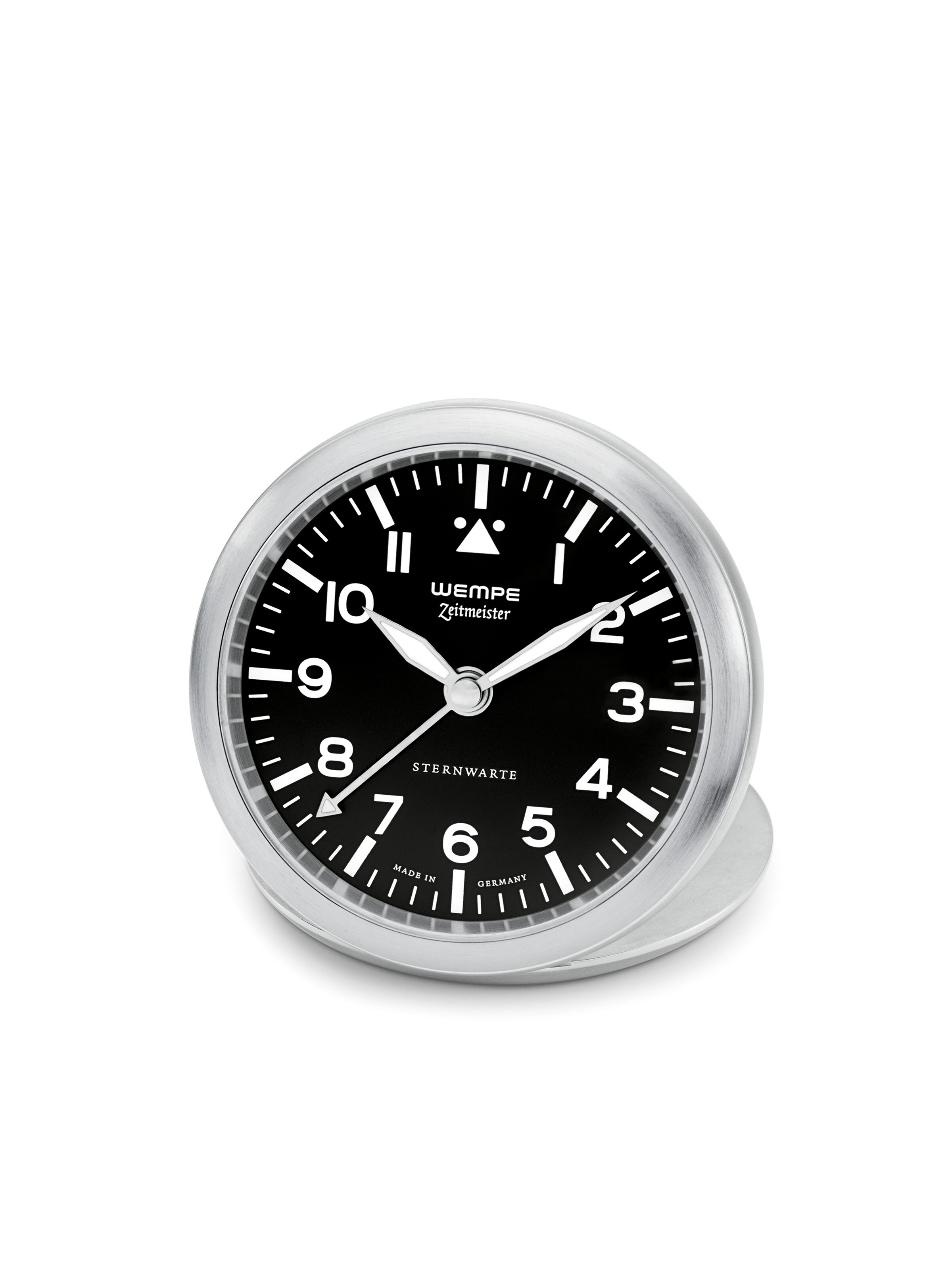 Der Wempe Zeitmeister Fliegeruhr Wecker aus Edelstahl mit schwarzem Zifferblatt verschönert nicht nur pünktlich das tägliche Aufstehen - der elegante Klassiker ist auch die perfekte Ergänzung zu den Wempe Zeitmeister Armbanduhren. Der klappbare Deckel macht ihn zu einem idealen Reisebegleiter und sorgt zusätzlich für einen sicheren Stand.