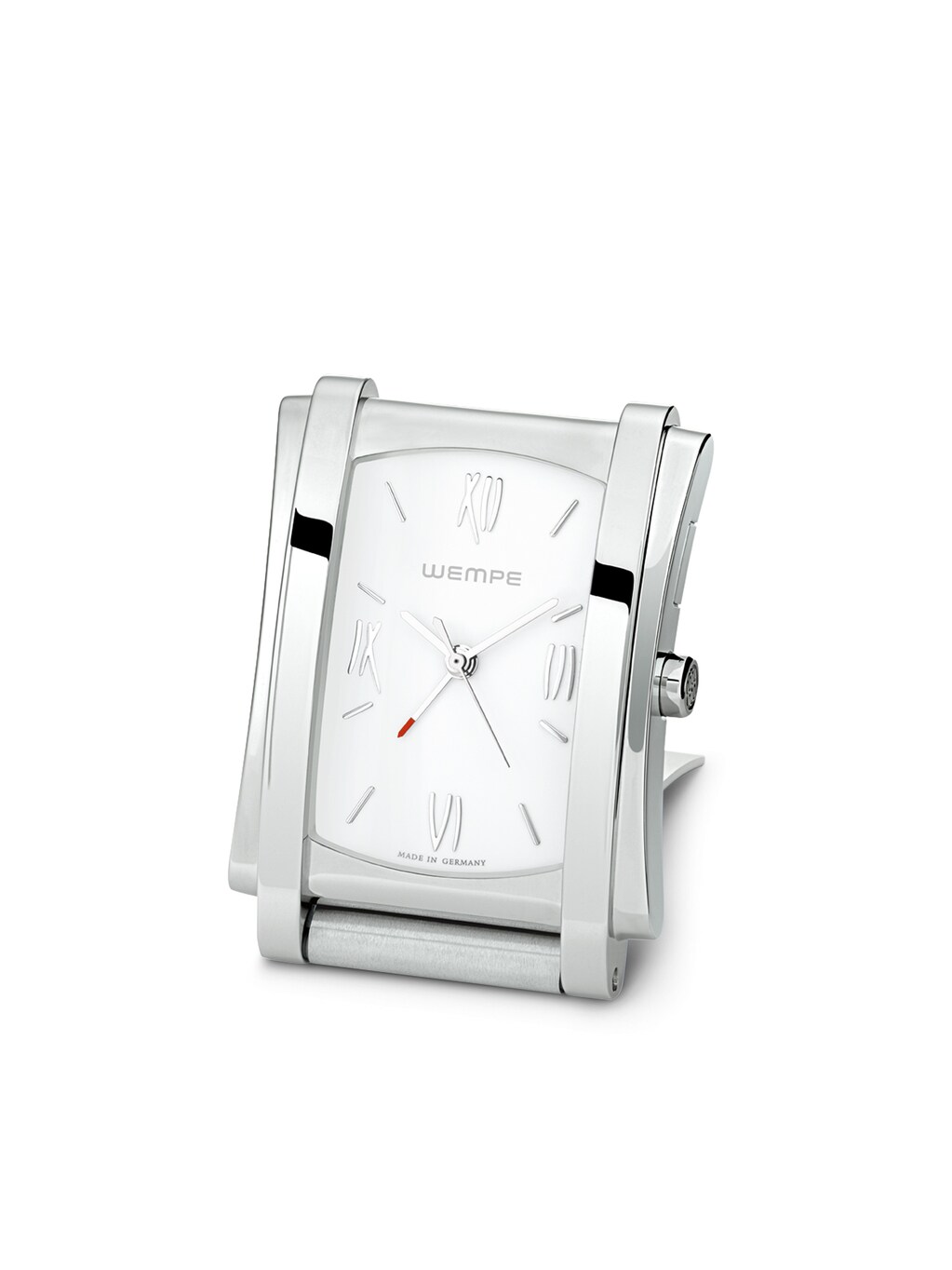 Der Wempe Zeitmeister Manchette Wecker aus Edelstahl verschönert nicht nur pünktlich das tägliche Aufstehen - der elegante Klassiker ist auch die perfekte Ergänzung zu den Wempe Zeitmeister Armbanduhren. Der klappbare Deckel macht ihn zu einem idealen Reisebegleiter und sorgt zusätzlich für einen sicheren Stand.