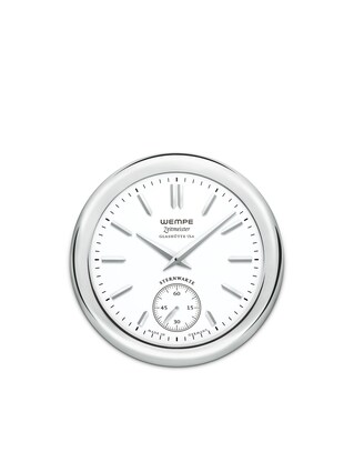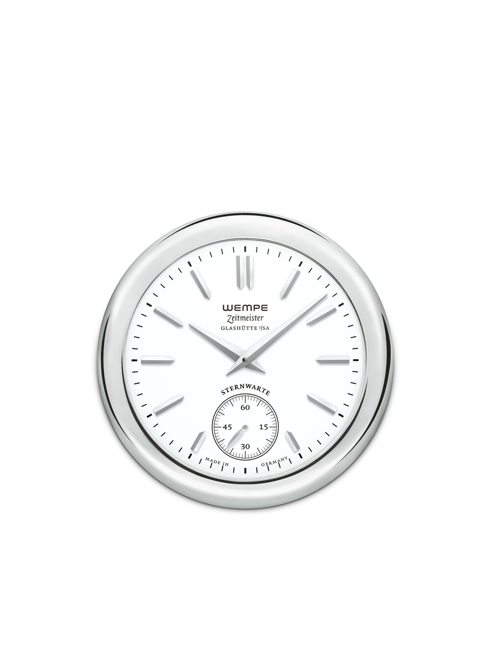 Die Zeitmeister Wanduhr von Wempe Glashütte i/SA kommt ganz ohne Pendel aus - geht aber auf die Sekunde genau. In dem runden Aluminiumgehäuse mit einem Durchmesser von 40 Zentimetern sorgt ein Quarzwerk für den richtigen Takt. Als weitere Funktion auf dem silbernen Zifferblatt wird die kleine Sekunde unter dem robusten Mineralglas angezeigt. Zeiger und Indizes sind wie das Gehäuse aus Aluminium gefertigt.