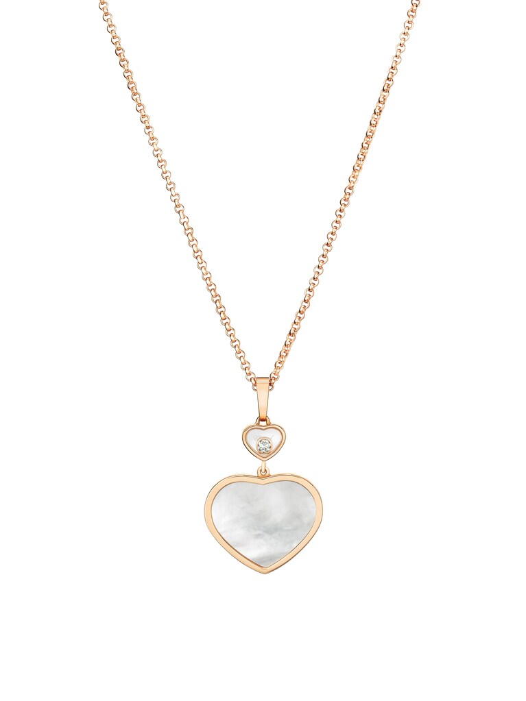 Einzigartige Kreationen, die ein Motiv von besonderer Bedeutung für Chopard feiern: das Herz. Als zeitloses Symbol für Liebe, Großzügigkeit und Lebenskraft ziert es den Anhänger Happy Hearts. Im Zentrum der grazilen Kette aus 18k Roségold stehen gleich zwei Herzen: ein größeres mit schimmerndem Perlmutt und ein kleineres Herz, das den ikonischen tanzenden Diamanten mit 0,05 ct in sich trägt. Süßes Detail ist das filigrane Chopard-C, das den Verschluss schmückt. Durch Zwischenösen kann die Länge von 45 Zentimetern verkürzt werden. Eine liebevolle Geschenkidee für die Menschen, die Ihnen am Herz liegen.