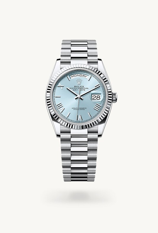Die geriffelte Lünette von Rolex ist ein Markenzeichen. Ursprünglich hatte die Riffelung der Oyster Lünette einen praktischen Zweck: Sie diente zum Verschrauben mit dem Gehäuse, um die Wasserdichtheit der Armbanduhr zu gewährleisten. Die Riffelung entsprach deshalb der des Gehäusebodens, der ebenfalls mithilfe von Rolex Spezialwerkzeugen mit dem Gehäuse verschraubt wurde, um die Uhr wasserdicht zu machen. Mit der Zeit erhielt die Riffelung eine rein ästhetische Funktion und wurde zu einem prägenden Element des stilistischen Markenerbes von Rolex. Heute ist die geriffelte Lünette ein Distinktionsmerkmal, das bei dieser Day-Date 36 in Platin gefertigt wird.