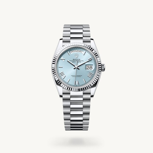 Das eisblaue Zifferblatt ist das dezente und exklusive Erkennungsmerkmal einer Rolex Armbanduhr in Platin. Rolex verwendet Platin, das edelste unter den Metallen, für die feinsten Armbanduhren. Diese exklusive Zifferblattfarbe ist nur bei der Day‑Date, dem Cosmograph Daytona, der Perpetual 1908 und der Land‑Dweller zu finden.