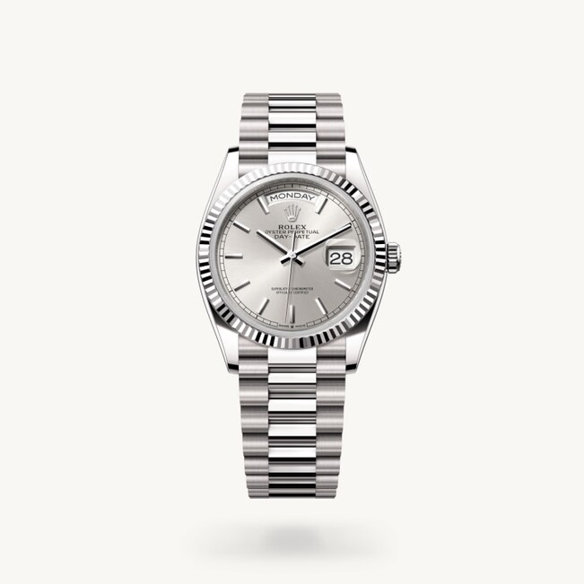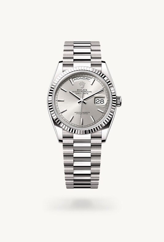 Die geriffelte Lünette von Rolex ist ein Markenzeichen. Ursprünglich hatte die Riffelung der Oyster Lünette einen praktischen Zweck: Sie diente zum Verschrauben mit dem Gehäuse, um die Wasserdichtheit der Armbanduhr zu gewährleisten. Die Riffelung entsprach deshalb der des Gehäusebodens, der ebenfalls mithilfe von Rolex Spezialwerkzeugen mit dem Gehäuse verschraubt wurde, um die Uhr wasserdicht zu machen. Mit der Zeit erhielt die Riffelung eine rein ästhetische Funktion und wurde zu einem prägenden Element des stilistischen Markenerbes von Rolex. Heute ist die geriffelte Lünette ein Distinktionsmerkmal, das bei dieser Day-Date 36 in Gold gefertigt wird.