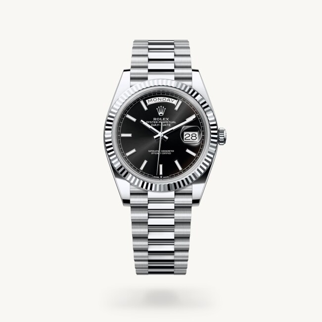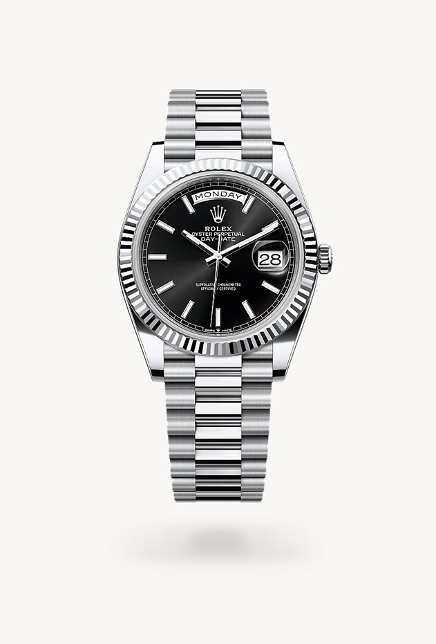 Die geriffelte Lünette von Rolex ist ein Markenzeichen. Ursprünglich hatte die Riffelung der Oyster Lünette einen praktischen Zweck: Sie diente zum Verschrauben mit dem Gehäuse, um die Wasserdichtheit der Armbanduhr zu gewährleisten. Die Riffelung entsprach deshalb der des Gehäusebodens, der ebenfalls mithilfe von Rolex Spezialwerkzeugen mit dem Gehäuse verschraubt wurde, um die Uhr wasserdicht zu machen. Mit der Zeit erhielt die Riffelung eine rein ästhetische Funktion und wurde zu einem prägenden Element des stilistischen Markenerbes von Rolex. Heute ist die geriffelte Lünette ein Distinktionsmerkmal, das bei dieser Day-Date 40 in Platin gefertigt wird.