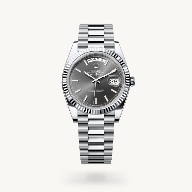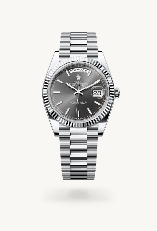 Die geriffelte Lünette von Rolex ist ein Markenzeichen. Ursprünglich hatte die Riffelung der Oyster Lünette einen praktischen Zweck: Sie diente zum Verschrauben mit dem Gehäuse, um die Wasserdichtheit der Armbanduhr zu gewährleisten. Die Riffelung entsprach deshalb der des Gehäusebodens, der ebenfalls mithilfe von Rolex Spezialwerkzeugen mit dem Gehäuse verschraubt wurde, um die Uhr wasserdicht zu machen. Mit der Zeit erhielt die Riffelung eine rein ästhetische Funktion und wurde zu einem prägenden Element des stilistischen Markenerbes von Rolex. Heute ist die geriffelte Lünette ein Distinktionsmerkmal, das bei dieser Day-Date 40 in Platin gefertigt wird.