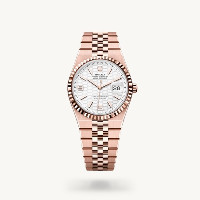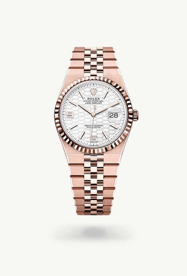 Die geriffelte Lünette von Rolex ist ein Markenzeichen. Ursprünglich hatte die Riffelung der Oyster Lünette einen praktischen Zweck: Sie diente zum Verschrauben mit dem Gehäuse, um die Wasserdichtheit der Armbanduhr zu gewährleisten. Die Riffelung entsprach deshalb der des Gehäusebodens, der ebenfalls mithilfe von Rolex Spezialwerkzeugen mit dem Gehäuse verschraubt wurde, um die Uhr wasserdicht zu machen. Mit der Zeit erhielt die Riffelung eine rein ästhetische Funktion und wurde zu einem prägenden Element des stilistischen Markenerbes von Rolex. Heute ist die geriffelte Lünette ein Distinktionsmerkmal, das bei dieser Land-Dweller 36 in Gold gefertigt wird.