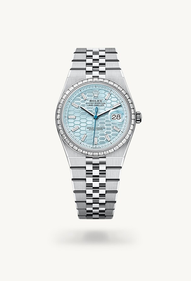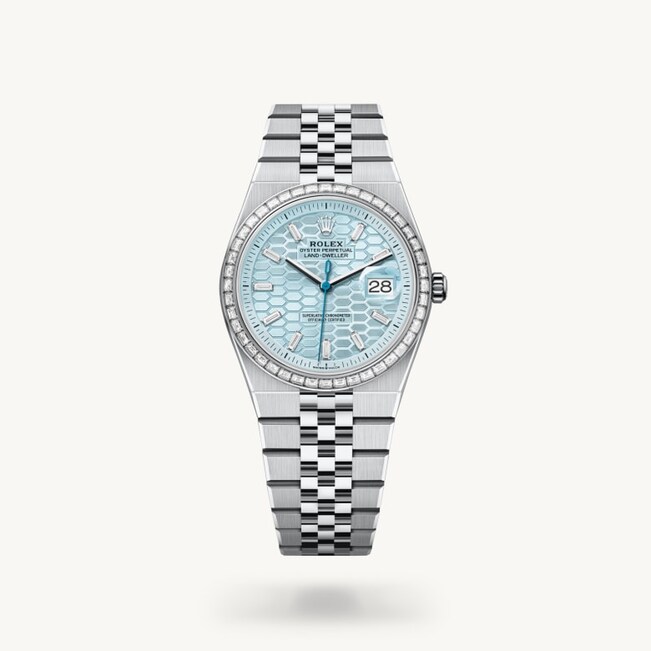 Dieses Zifferblatt in Eisblau – ein Farbton, der Armbanduhren aus Platin vorbehalten ist – zeichnet sich durch ein Wabenmuster mit Radialschliff aus. Es wird mithilfe von traditionellen oder Hightech-Verfahren vollständig im Hause Rolex hergestellt. Das Schneiden der Waben sowie die Ausführung der Rillen in den Vertiefungen zwischen den Waben erfolgen mithilfe eines Femtosekundenlasers. Das Zifferblatt verfügt über 10 Indizes mit Diamanten im Baguetteschliff.