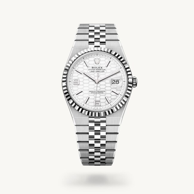 Die geriffelte Lünette von Rolex ist ein Markenzeichen. Ursprünglich hatte die Riffelung der Oyster Lünette einen praktischen Zweck: Sie diente zum Verschrauben mit dem Gehäuse, um die Wasserdichtheit der Armbanduhr zu gewährleisten. Die Riffelung entsprach deshalb der des Gehäusebodens, der ebenfalls mithilfe von Rolex Spezialwerkzeugen mit dem Gehäuse verschraubt wurde, um die Uhr wasserdicht zu machen. Mit der Zeit erhielt die Riffelung eine rein ästhetische Funktion und wurde zu einem prägenden Element des stilistischen Markenerbes von Rolex. Heute ist die geriffelte Lünette ein Distinktionsmerkmal, das bei dieser Land-Dweller 40 in Gold gefertigt wird.