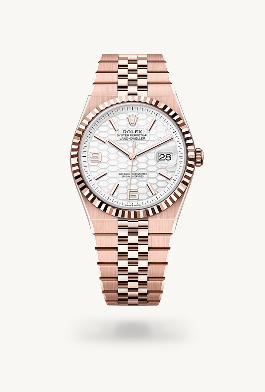 Die geriffelte Lünette von Rolex ist ein Markenzeichen. Ursprünglich hatte die Riffelung der Oyster Lünette einen praktischen Zweck: Sie diente zum Verschrauben mit dem Gehäuse, um die Wasserdichtheit der Armbanduhr zu gewährleisten. Die Riffelung entsprach deshalb der des Gehäusebodens, der ebenfalls mithilfe von Rolex Spezialwerkzeugen mit dem Gehäuse verschraubt wurde, um die Uhr wasserdicht zu machen. Mit der Zeit erhielt die Riffelung eine rein ästhetische Funktion und wurde zu einem prägenden Element des stilistischen Markenerbes von Rolex. Heute ist die geriffelte Lünette ein Distinktionsmerkmal, das bei dieser Land-Dweller 40 in Gold gefertigt wird.