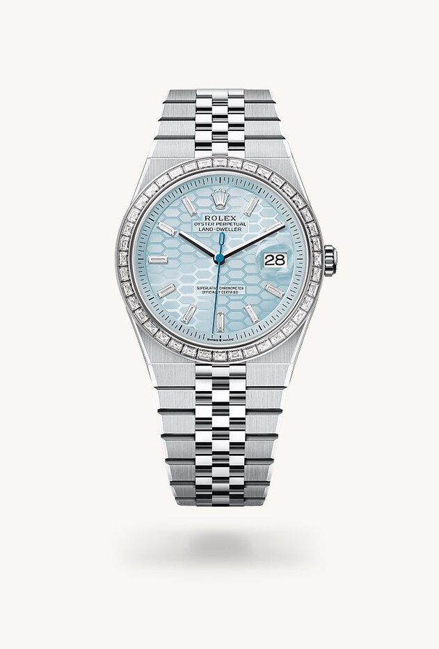 Dieses Zifferblatt in Eisblau – ein Farbton, der Armbanduhren aus Platin vorbehalten ist – zeichnet sich durch ein Wabenmuster mit Radialschliff aus. Es wird mithilfe von traditionellen oder Hightech-Verfahren vollständig im Hause Rolex hergestellt. Das Schneiden der Waben sowie die Ausführung der Rillen in den Vertiefungen zwischen den Waben erfolgen mithilfe eines Femtosekundenlasers. Das Zifferblatt verfügt über 10 Indizes mit Diamanten im Baguetteschliff.