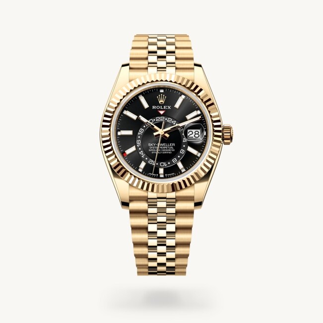 Die geriffelte Lünette von Rolex ist ein Markenzeichen. Ursprünglich hatte die Riffelung der Oyster Lünette einen praktischen Zweck: Sie diente zum Verschrauben mit dem Gehäuse, um die Wasserdichtheit der Armbanduhr zu gewährleisten. Die Riffelung entsprach deshalb der des Gehäusebodens, der ebenfalls mithilfe von Rolex Spezialwerkzeugen mit dem Gehäuse verschraubt wurde, um die Uhr wasserdicht zu machen. Mit der Zeit erhielt die Riffelung eine rein ästhetische Funktion und wurde zu einem prägenden Element des stilistischen Markenerbes von Rolex. Heute ist die geriffelte Lünette ein Markenzeichen, das ausschließlich in Gold gefertigt wird. Die Sky‑Dweller verfügt über das Ring-Command-System – ein Mechanismus, der es dem Träger der Armbanduhr durch das Zusammenspiel von drehbarer Lünette, Aufzugskrone und Uhrwerk ermöglicht, die Funktionen der Armbanduhr nacheinander auszuwählen und einfach, schnell und sicher einzustellen.