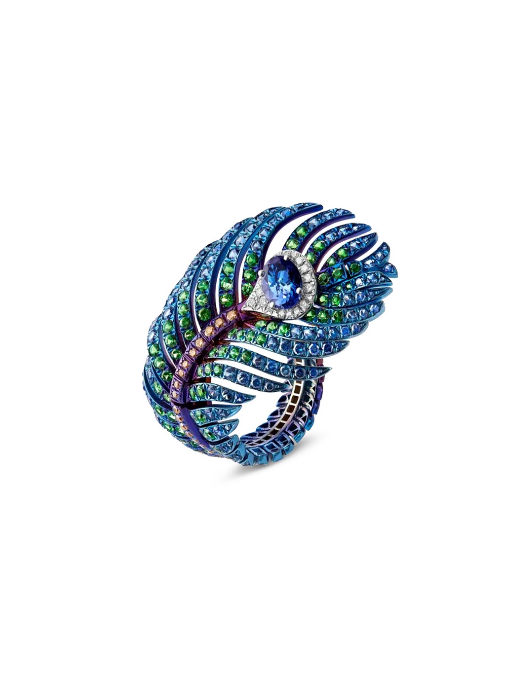 Ring Plume de Paon 18k Weißgold/Titan, 1 Tansanit 0,74 ct, 123 Saphire 1,70 ct, 85 Tsavorite 1,34 ct, 62 Brillanten 0,47 ct, 25 mm Breite | Referenz-Nr. 60RG1996