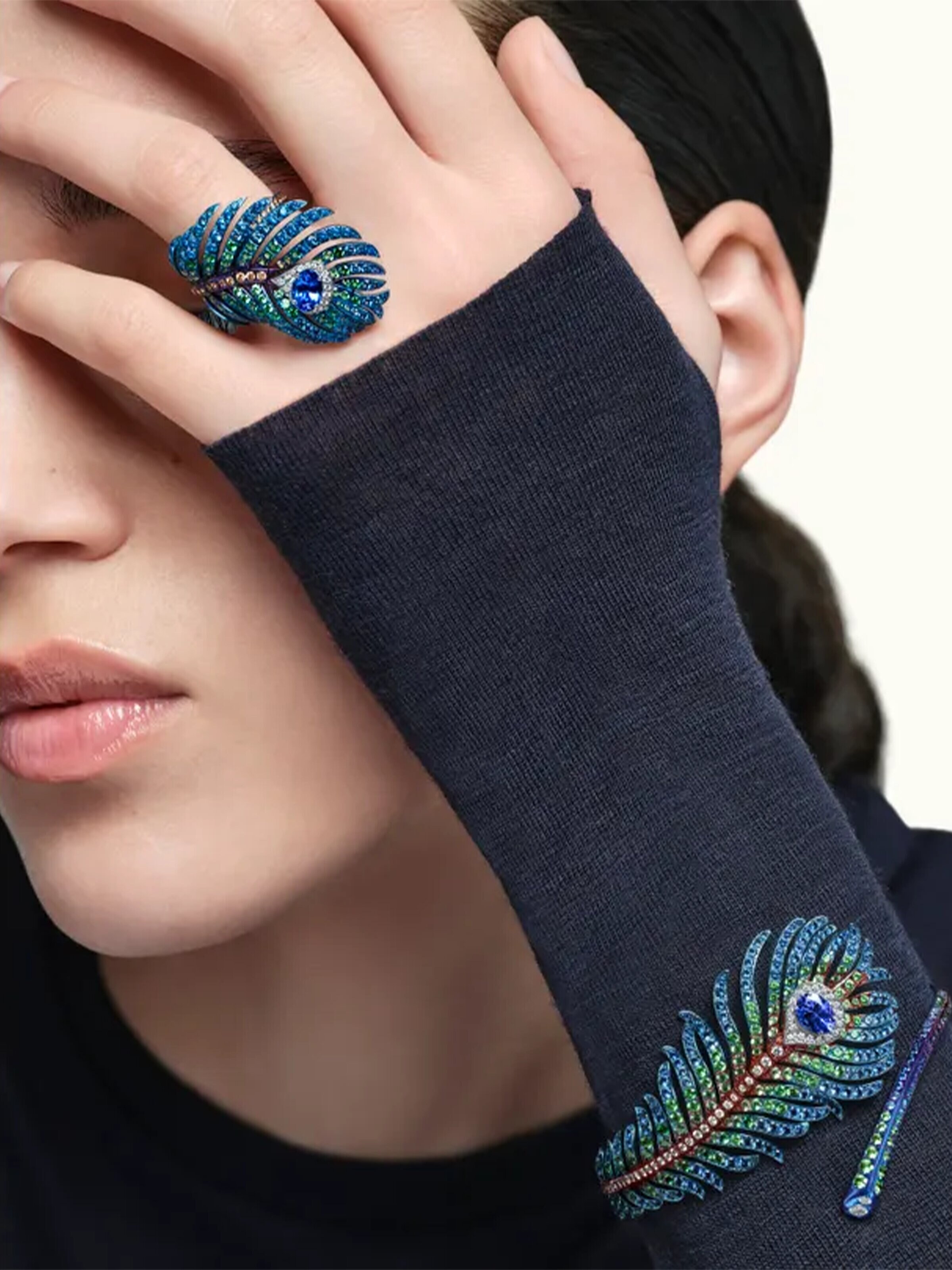 Der Plume de Paon-Ring verführt mit Leichtigkeit und Eleganz. Ein ovaler Tansanit in Titan und Weißgold bildet das Herzstück, während Saphire, Tsavoriten und Diamanten wie die Farbverläufe einer echten Pfauenfeder sanft verblassen. Titan, dreimal leichter als Gold, verleiht dem Ring eine fast schwerelose Anmut – jede Bewegung lässt die Feder lebendig erscheinen.