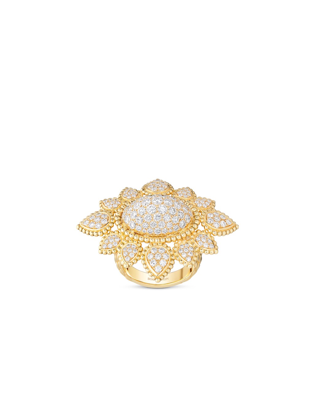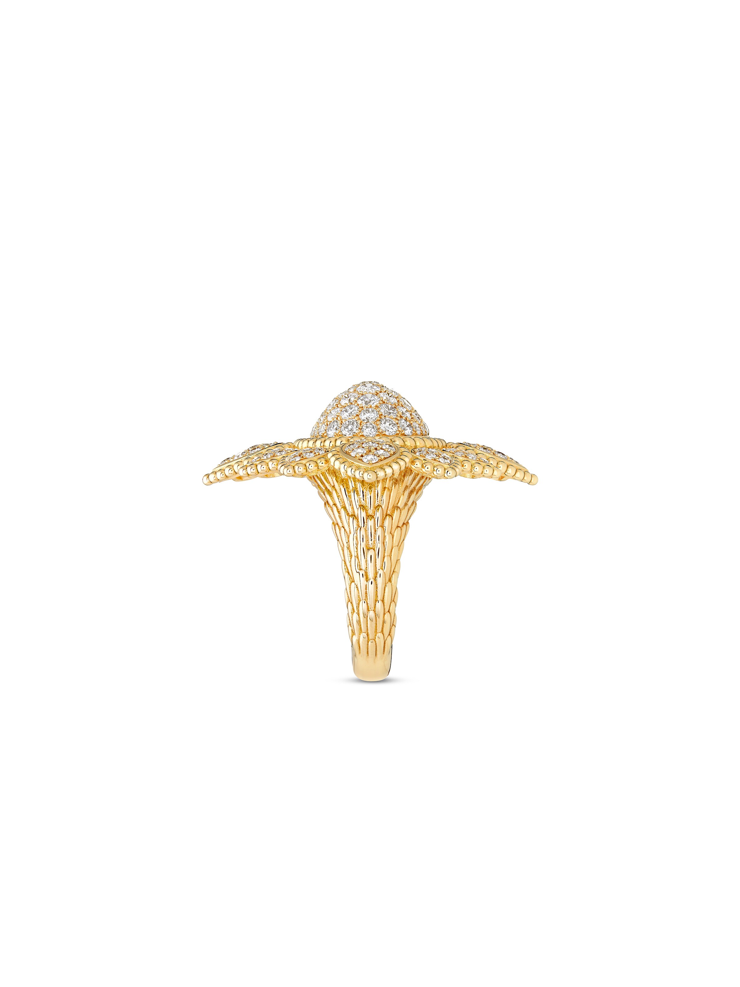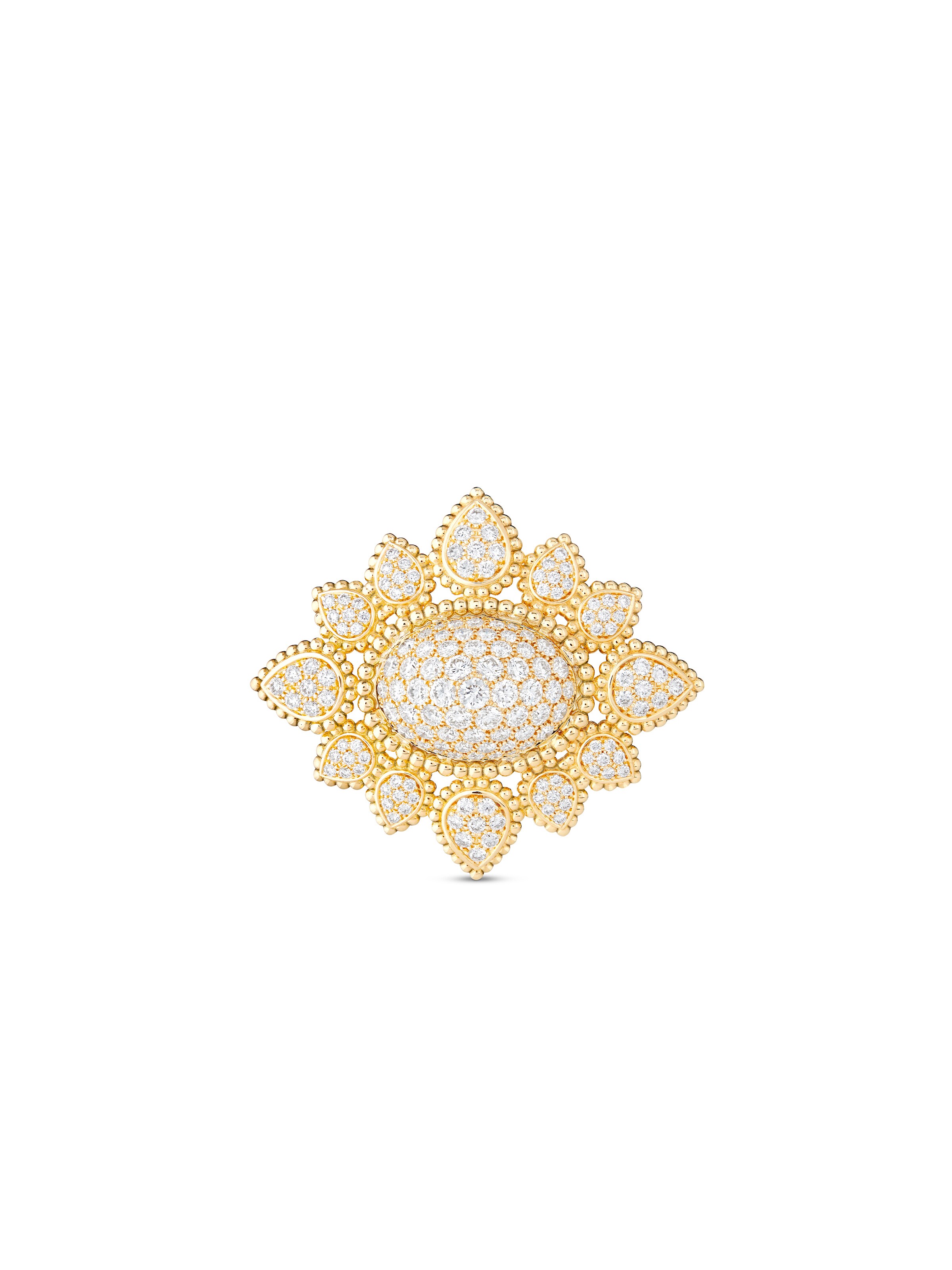 Mit den Schmuckstücken der Linie Serpent Bohème beweist Boucheron einmal mehr den feinen Sinn für einzigartige Formen und Strukturen. Der Ring Serpent Bohème Vintage ist inspiriert von dem ikonischen Design aus den 1970er-Jahren und fügt elf diamantbesetzte Blätter zu einer opulenten Blüte zusammen. 157 Diamanten mit 2,22 ct sorgen für ein funkelndes Frühlingserwachen in 18k Gelbgold und einen eleganten Auftritt auf dem roten Teppich.