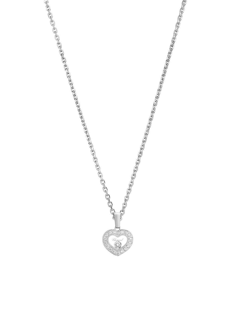 Spielerische Leichtigkeit trifft kühne Eleganz. Der funkelnde Anhänger Happy Diamonds Icons von Chopard präsentiert einen der ikonischen, frei beweglichen Diamanten in einem Herzelement aus 18k Weißgold. Der Brillant von 0,05 ct scheint zwischen den zwei Saphirgläsern zu tanzen und sorgt zusammen mit den 18 Brillanten von 0,14 ct des Herzanhängers für bezaubernde Lichtreflexe. Süßes Detail ist das grazile Chopard-C, das den Verschluss schmückt. Durch Zwischenösen kann die Länge von 42 Zentimetern verkürzt werden. Ein einzigartiges Geschenk für Menschen, die pure Lebensfreude und Unabhängigkeit lieben.