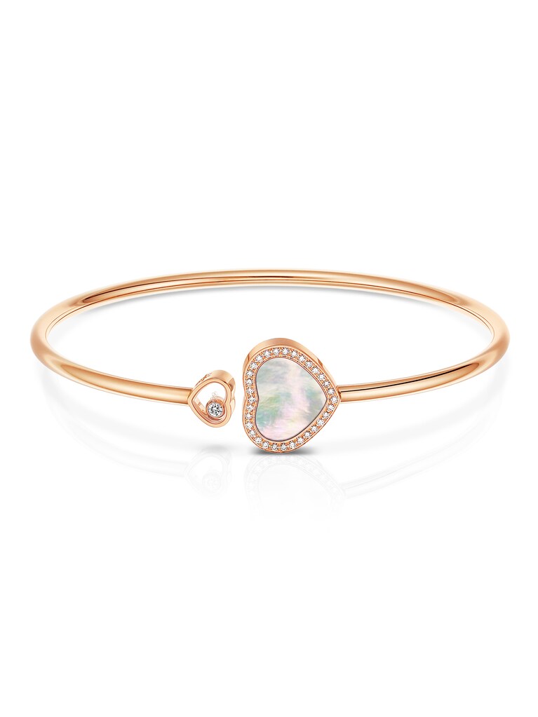 Einzigartige Kreationen, die ein Motiv von besonderer Bedeutung für Chopard feiern: das Herz. Als zeitloses Symbol für Liebe, Großzügigkeit und Lebenskraft ziert es den Armreif Happy Hearts. Im Zentrum des strahlenden Armschmucks aus 18k Roségold stehen gleich zwei Herzen: ein größeres Herz aus schimmerndem Perlmutt, das von 32 Brillanten mit insgesamt 0,14 ct eingerahmt wird, und ein kleineres Herz, das den ikonischen tanzenden Diamanten mit 0,05 ct in sich trägt. Die offenen Enden des 17 Zentimeter langen Armreifs sorgen für angenehmes An- und Ablegen des Schmuckstücks. Eine liebevolle Geschenkidee für die Menschen, die Ihnen am Herz liegen.