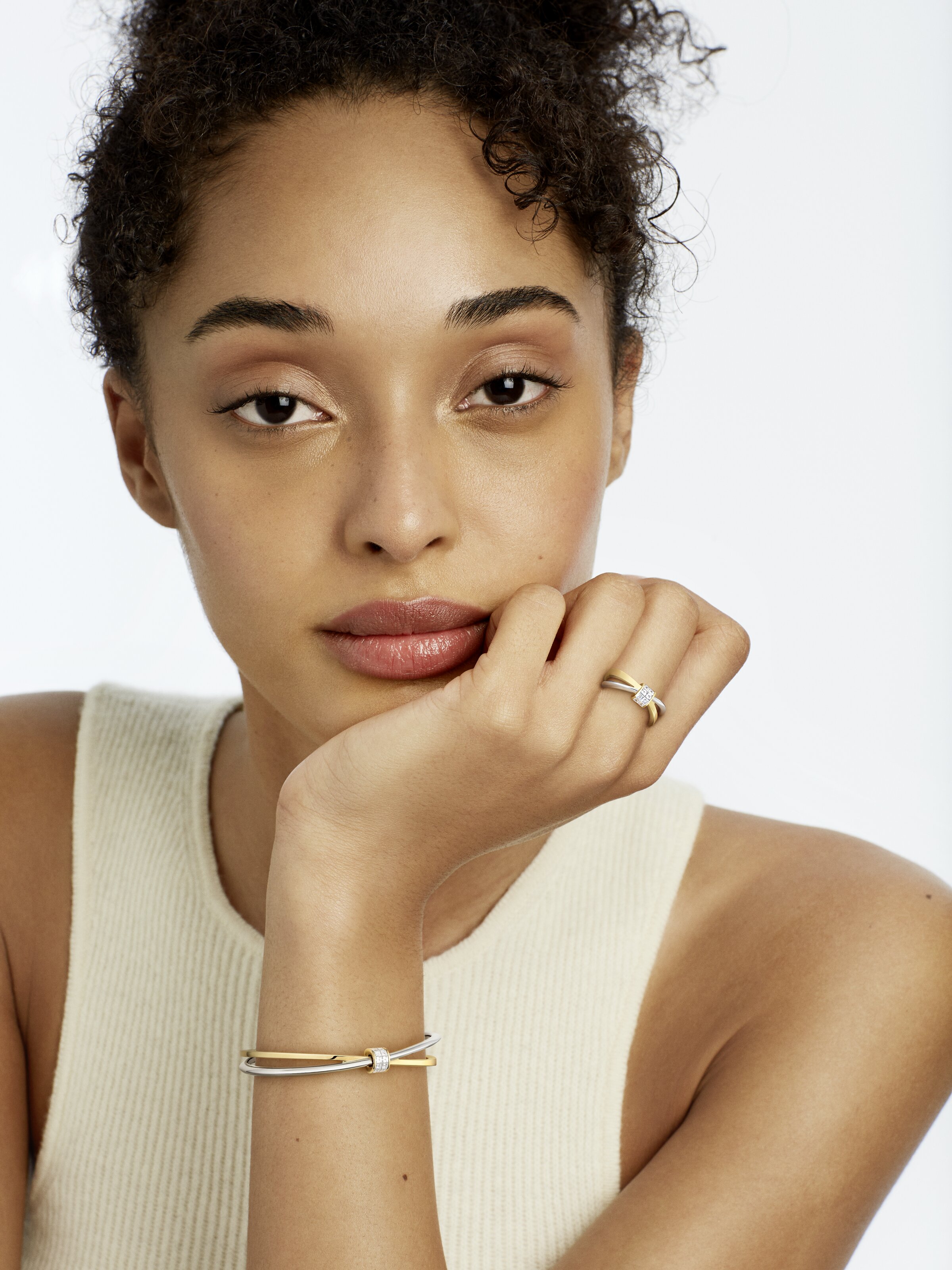 Fließende Linien treffen auf grafische Klarheit. Der Armreif Twist von Fine Jewelry interpretiert die Form des offenen Kreises neu und spielt mit dem Wechsel von 18k Gelbgold und 18k Weißgold. Highlight ist das verbindende Element mit zehn Diamanten im Baguette-Schliff von insgesamt 0,35 ct, die in einer präzisen Invisible Setting Fassung angeordnet sind. So entsteht ein ausdrucksstarker Armschmuck, dessen skulpturale Form einen stilvollen Akzent zu Alltags- und Business-Outfits setzt.