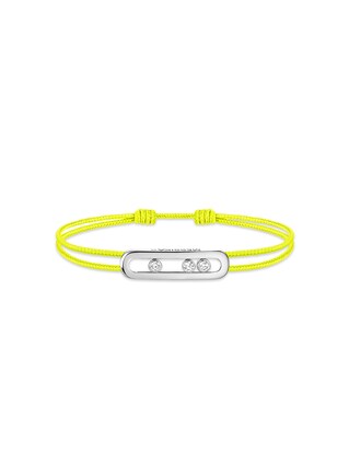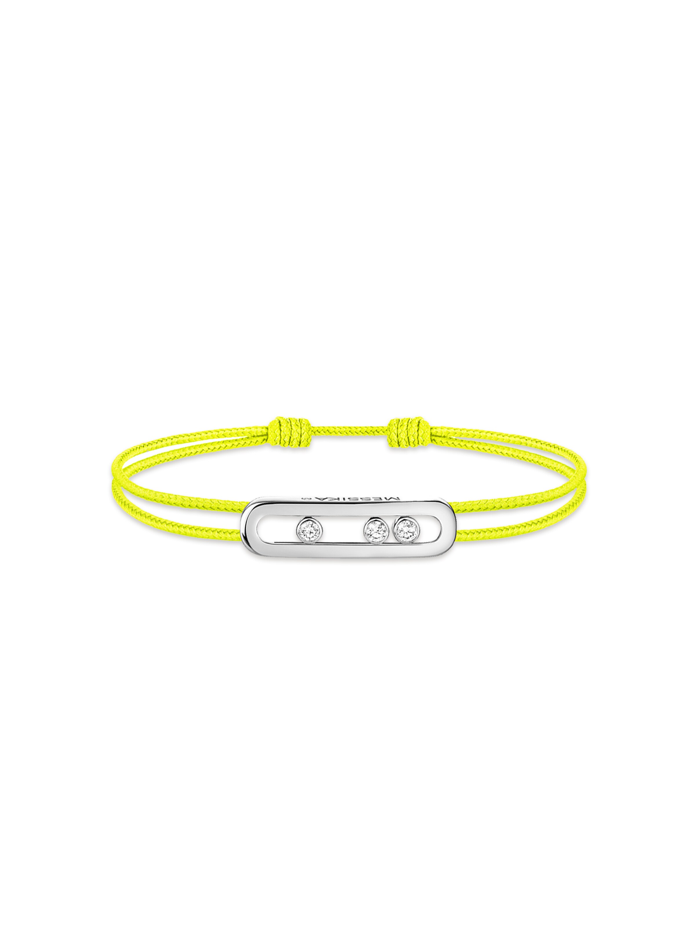 Eleganz trifft auf Lässigkeit. Das Armband Care(s) von Messika setzt drei bewegliche Diamanten selbstbewusst in Szene. Die Bühne bildet der ikonische Move-Käfig in 18k Weißgold. Zusammen mit dem größenverstellbaren Textilarmband in leuchtendem Gelb entsteht ein Eyecatcher für den Alltag, der einen sportlich-dynamischen Look ergänzt und sich perfekt mit weiteren Armbändern kombinieren lässt.