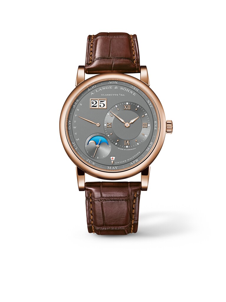 Lange 1 Ewiger Kalender 41,9 mm, 18k Rotgold mit braunem Alligatorlederarmband, Automatik-Manufakturkaliber L021.3 mit ewigem Kalender und Mondphasenanzeige | Referenz-Nr. LB410112