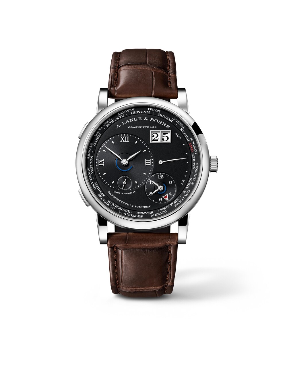 Lange 1 Zeitzone 41,9 mm, 18k Weißgold mit braunem Alligatorlederarmband, Handaufzug-Manufakturkaliber L141.1 mit zweiter Zeitzonen- und Gangreservenanzeige | Referenz-Nr. LA410109