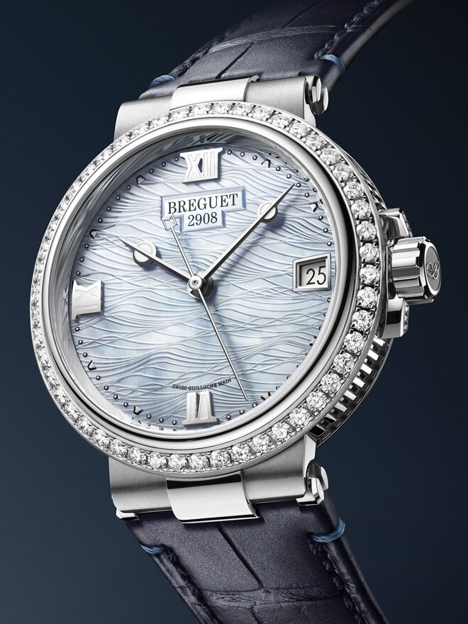 Der Stil der Zeitmesser ist entschieden modern und verbindet Eleganz mit Sportlichkeit. Jede einzelne Breguet Marine hat Seefahrerblut in den Adern, was sich beispielsweise im exquisiten Guilloche-Dekor in Form von Wellen auf den Zifferblättern einiger Modelle ausdrückt. Die Welle als stilisiertes Motiv schmückt auch die Kronen. Die neugestalteten Kannelüren in den Gehäuseflanken und die zentralen Bandanstöße verleihen der Breguet Marine einen zeitgemäßen dynamischen Stil.