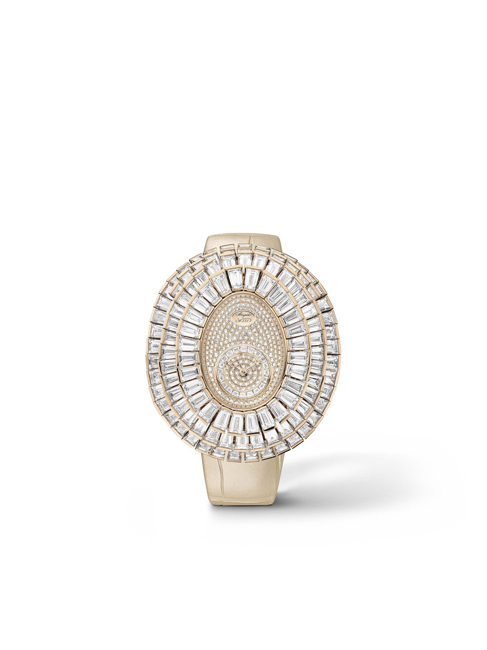 Die Reine de Naples Haute Joaillerie (Ref. GJE25BH20.8985DB) von Breguet ist eine Ode an die Schönheit und Eleganz, die speziell für Damen kreiert wurde. Mit ihrer limitierten Auflage von nur 250 Exemplaren weltweit verkörpert sie Exklusivität und Luxus. Das Herzstück dieser Uhr bildet das Manufakturkaliber 586/1, welches mit einer Gangreserve von 38 Stunden beeindruckt. Das Zifferblatt, kunstvoll besetzt mit Pavé, funkelt unter einem Saphirglas, welches die Zeit in einem unvergleichlichen Glanz erstrahlen lässt. Das Gehäuse aus 18k Breguet-Gold umschmeichelt das Handgelenk, während das beige Alligatorarmband mit einer Faltschließe für höchsten Tragekomfort sorgt. Der Saphirglasboden gewährt einen Blick auf das filigrane Innenleben dieser Uhr. Die Reine de Naples Haute Joaillerie ist nicht nur eine Uhr, sondern ein Schmuckstück, das die Zeit überdauert.