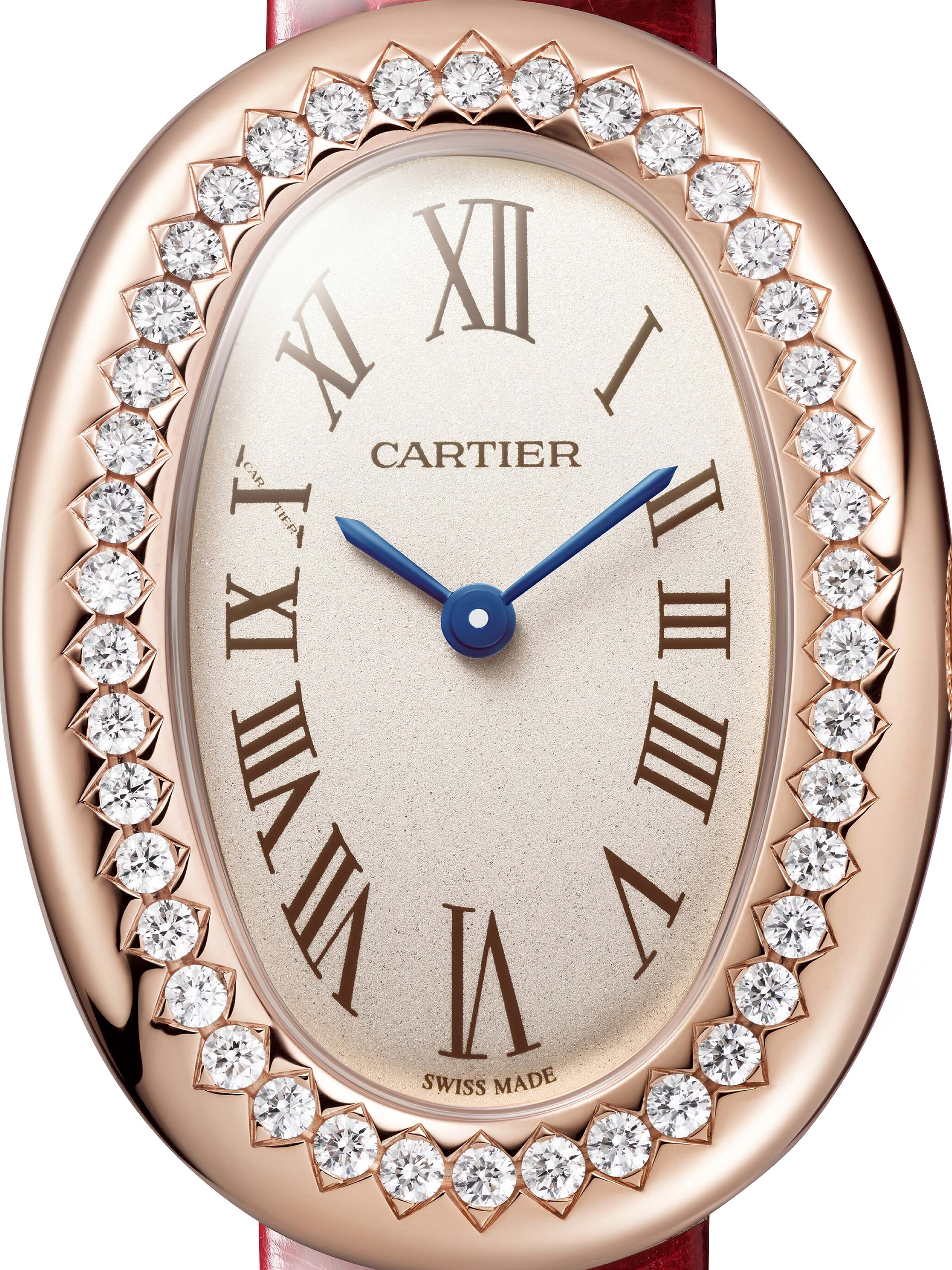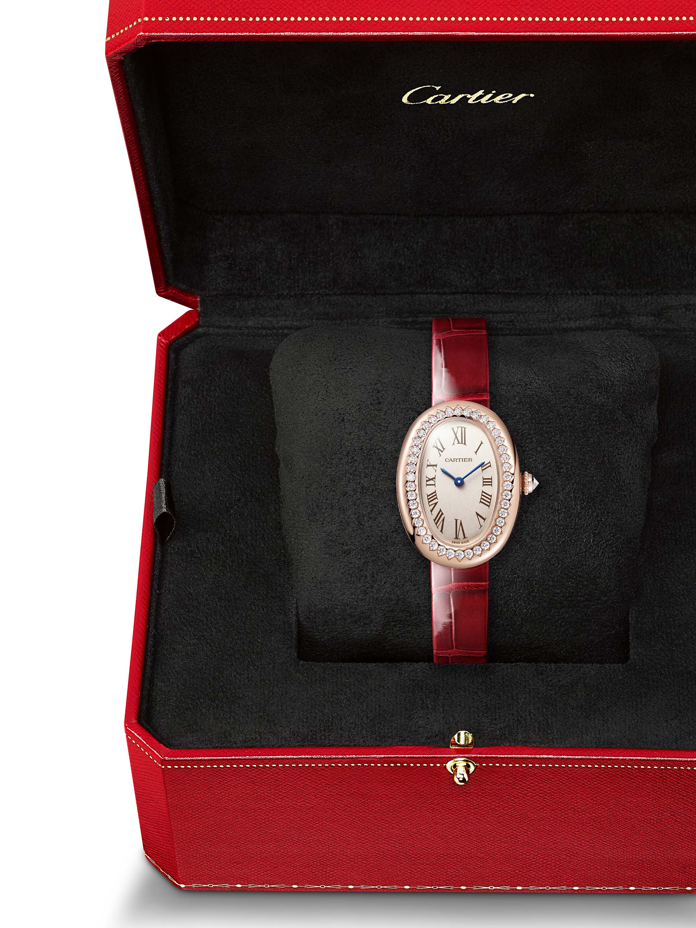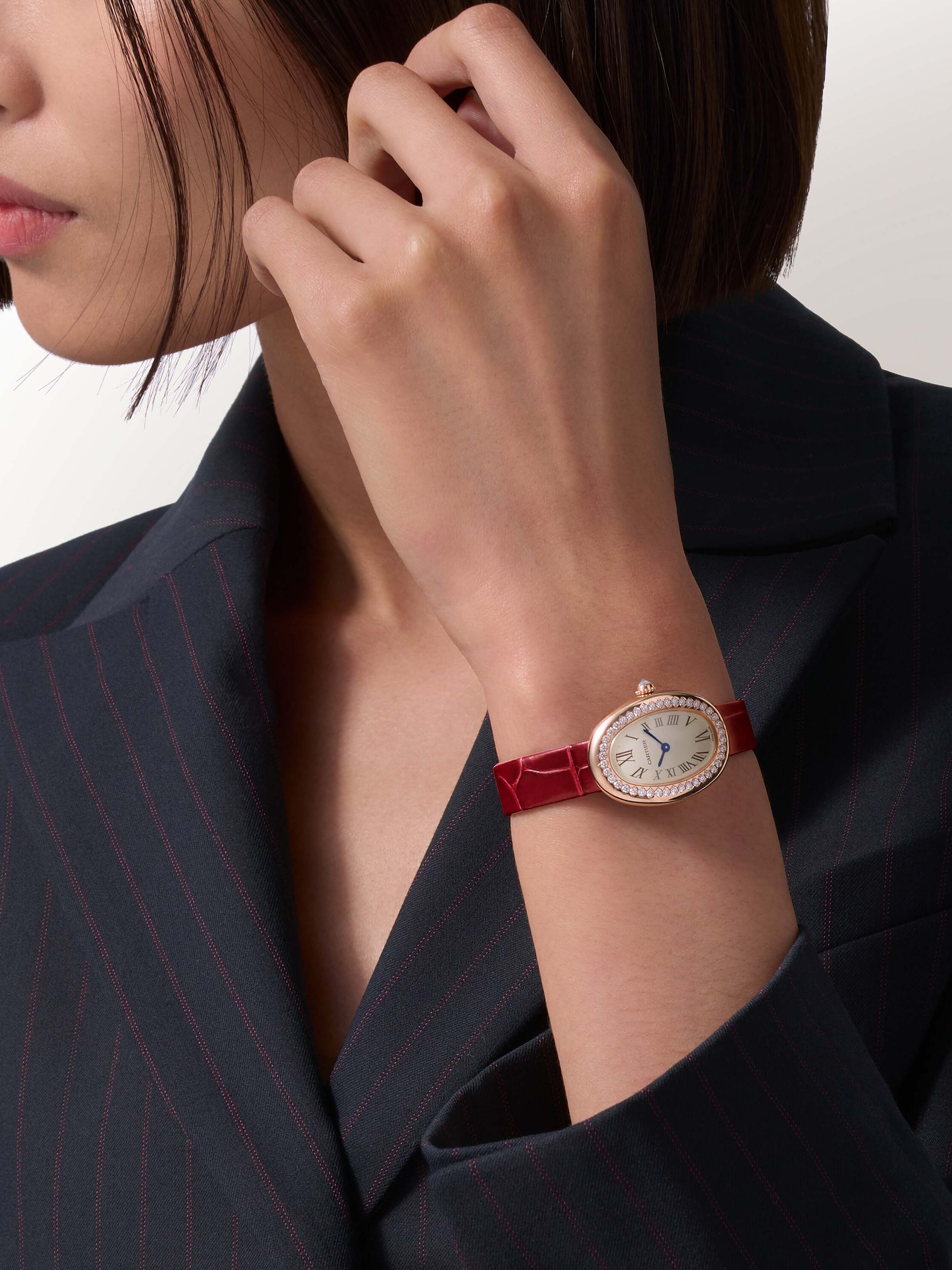 Baignoire de Cartier, kleines Modell, Quarzwerk. Gehäuse aus 750er Roségold, besetzt mit 42 Diamanten im Brillantschliff von insgesamt 0,48 Karat. Perlierte Krone aus 750er Roségold, mit einem Diamanten im Cabochonschliff von 0,08 verziert. Silberfarbenes Zifferblatt, schwertförmige Zeiger aus gebläutem Edelstahl, Saphirglas. Armband aus Alligatorleder rot lackiert, Stiftschließe aus 750er Roségold. Länge: 31,4 mm. Breite: 23,09 mm. Höhe: 6,95 mm. Wasserdicht bis zu 3 bar.