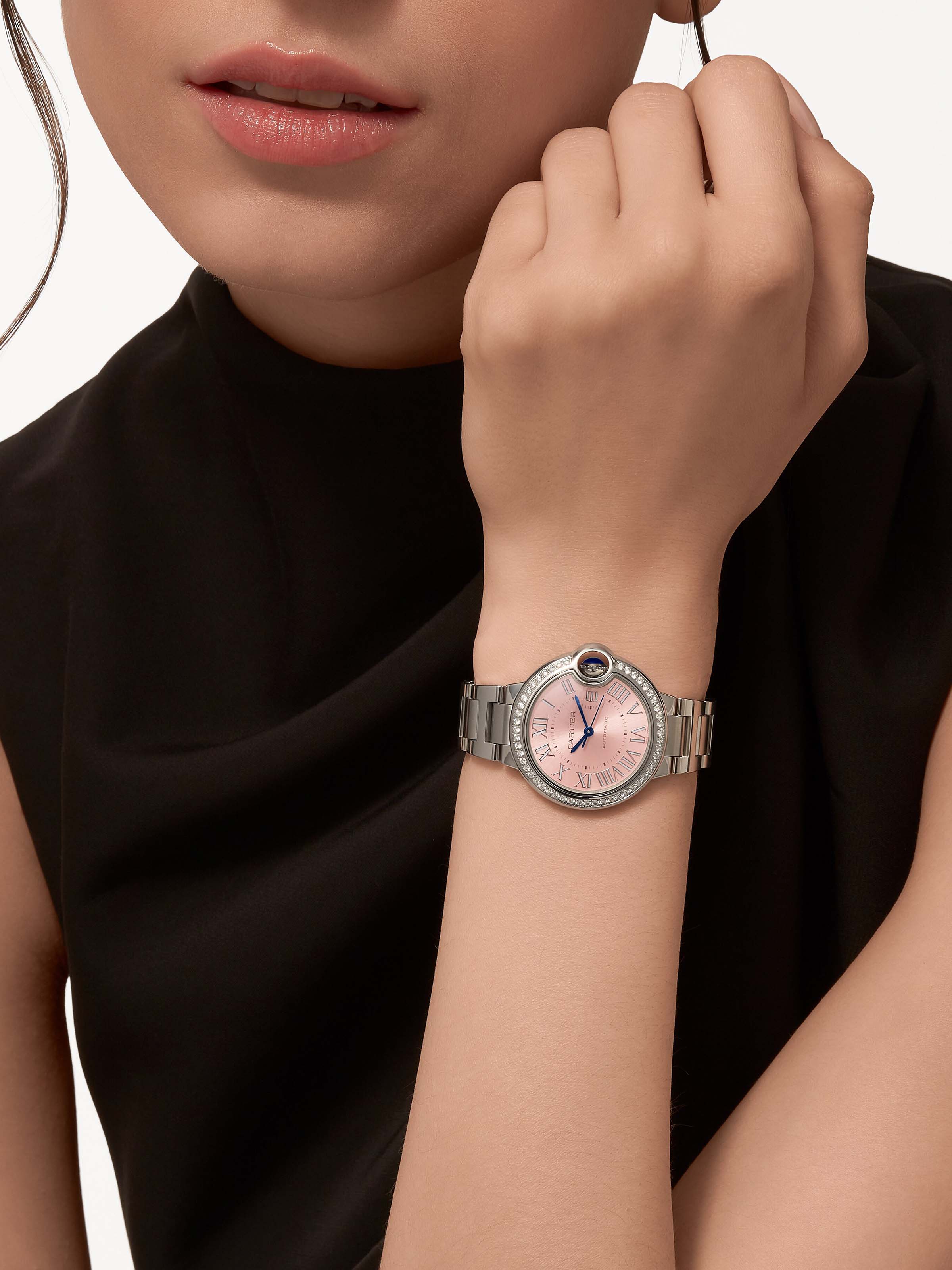 Ballon Bleu de Cartier, 33 mm, mechanisches Uhrwerk mit Automatikaufzug, Kaliber 1853MC. Gehäuse aus Stahl, kannelierte Krone aus Stahl mit einem synthetischen Spinellcabochon verziert. Lünette aus Stahl, besetzt mit 50 Diamanten im Brillantschliff von insgesamt 0,57 Karat. Rosafarbenes Zifferblatt mit Sonnenschliff. Gebläute Zeiger in Schwertform. Saphirglas. Austauschbares Armband aus Stahl. Gehäusedurchmesser: 33 mm. Höhe: 10,16 mm. Wasserdicht bis zu 3 bar.