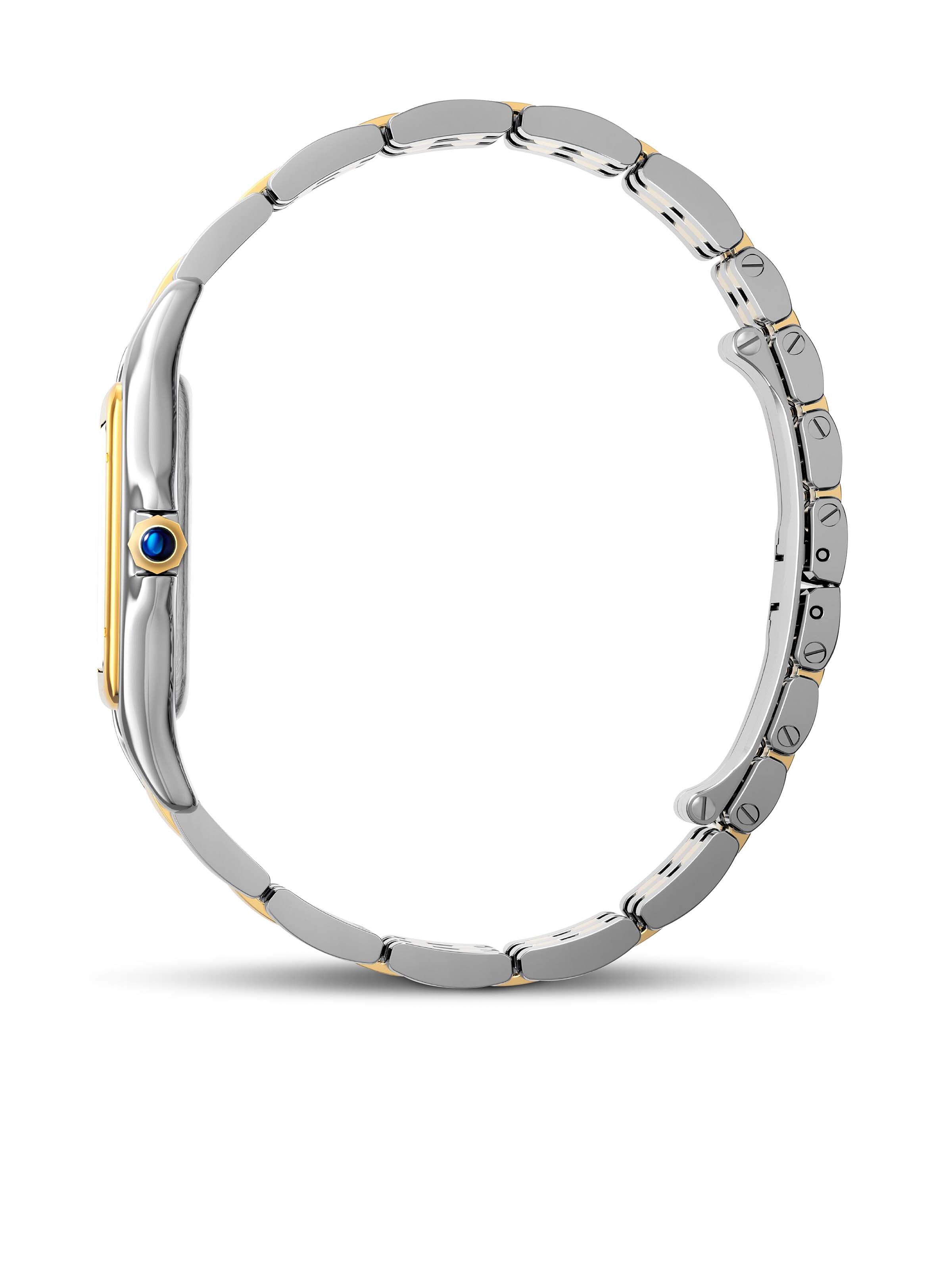 Panthère de Cartier, großes Modell, Quarzwerk. Gehäuse aus 750er Gelbgold und Stahl, Maße: 31 mm x 42 mm. Höhe: 6,71 mm, Krone mit einem synthetischen blauen Spinell besetzt, Zifferblatt in Silber, schwertförmige Zeiger aus gebläutem Stahl, Armband aus 750er Gelbgold und Edelstahl. Wasserdicht bis zu 3 bar.