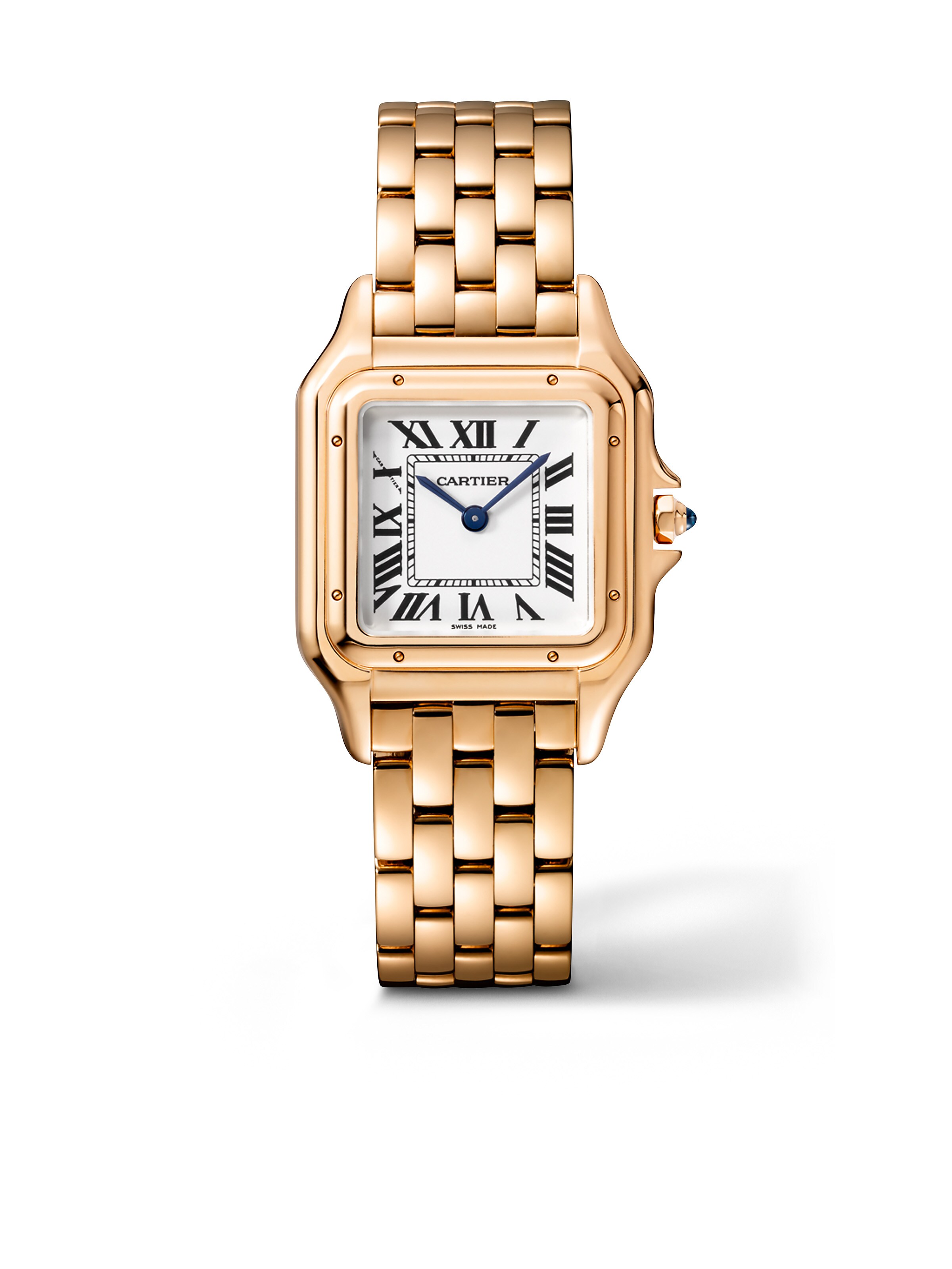 Panthère de Cartier, mittleres Modell, Quarzwerk. Gehäuse aus 750er Roségold, Größe: 29 mm x 37 mm, Höhe: 7 mm, Krone mit einem blauen Saphir besetzt, silberfarbenes Zifferblatt, schwertförmige Zeiger aus gebläutem Stahl, Armband aus 750er Roségold, wasserdicht bis zu 3 bar.