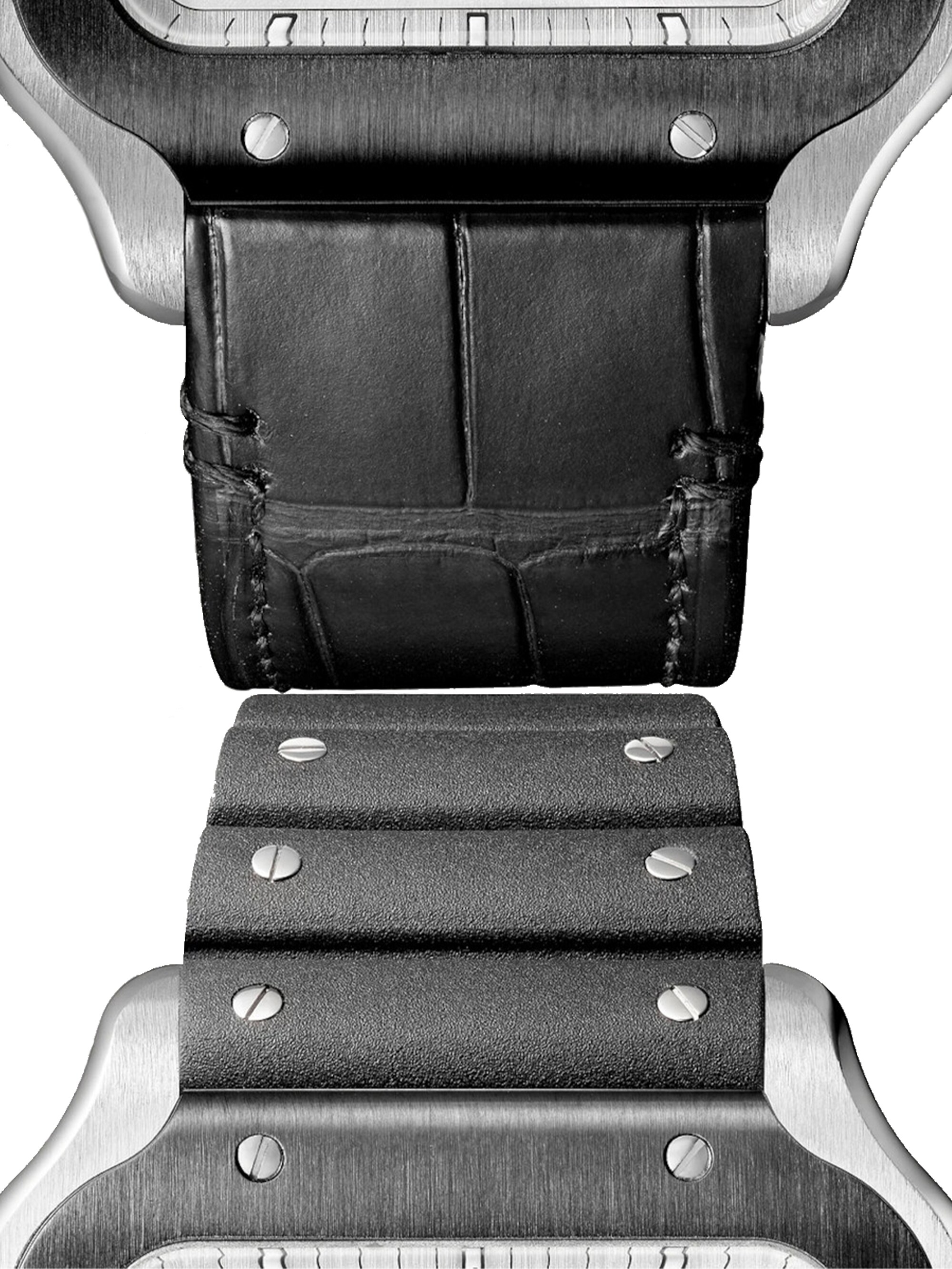 Santos, extragroßes Modell, mechanisches Chronographenwerk mit Automatikaufzug, Kaliber 1904 CH MC. Gehäuse aus Stahl, Lünette mit DLC-Beschichtung, Mehrkantaufzugskrone mit einem facettierten synthetischen schwarzen Spinell besetzt, satiniertes silberfarbenes Zifferblatt, schwertförmige Zeiger aus geschwärztem Stahl mit Leuchtmasse, Saphirglas. Erstes Armband aus Kautschuk, zweites Armband aus schwarzem "Gomma"-Alligatorleder, mit Faltschließe aus Stahl. Beide Armbänder sind mit dem QuickSwitch-Armbandwechselsystem ausgestattet. Gehäusebreite: 43,3 mm. Höhe: 12,4 mm. Wasserdicht bis 10 bar.