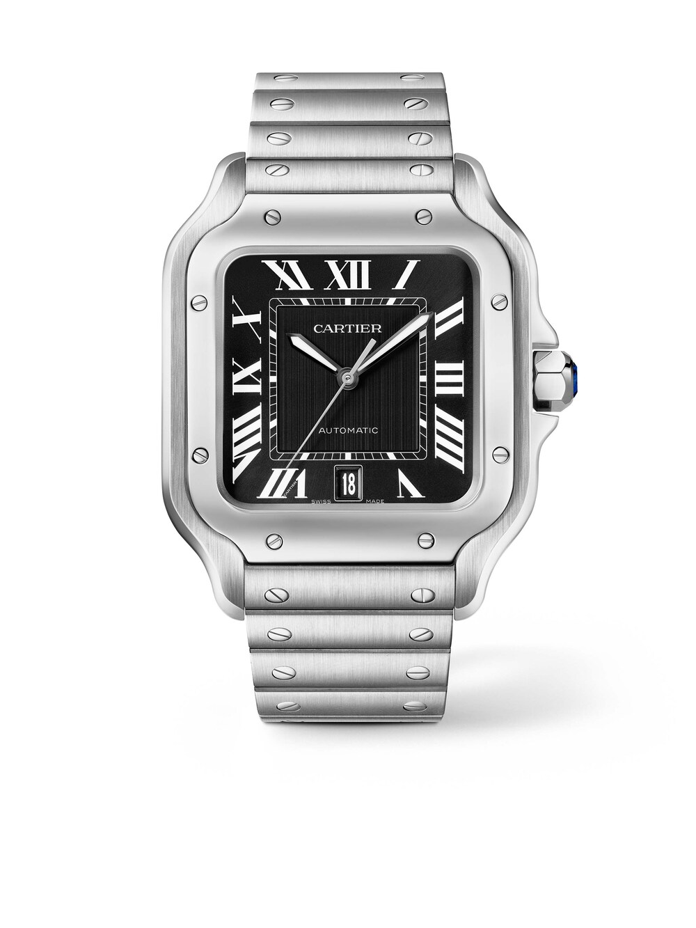 Santos, großes Modell, mechanisches Uhrwerk mit Automatikaufzug, Kaliber 1847 MC. Gehäuse aus Edelstahl, Mehrkantaufzugskrone mit einem facettierten synthetischen Spinell besetzt, schwarzes Zifferblatt, schwertförmige Zeiger aus poliertem Stahl, Saphirglas. Armband aus Edelstahl mit Faltschließe. Gehäusebreite: 40,00 mm. Höhe: 9,40 mm. Wasserdicht bis 10 bar.