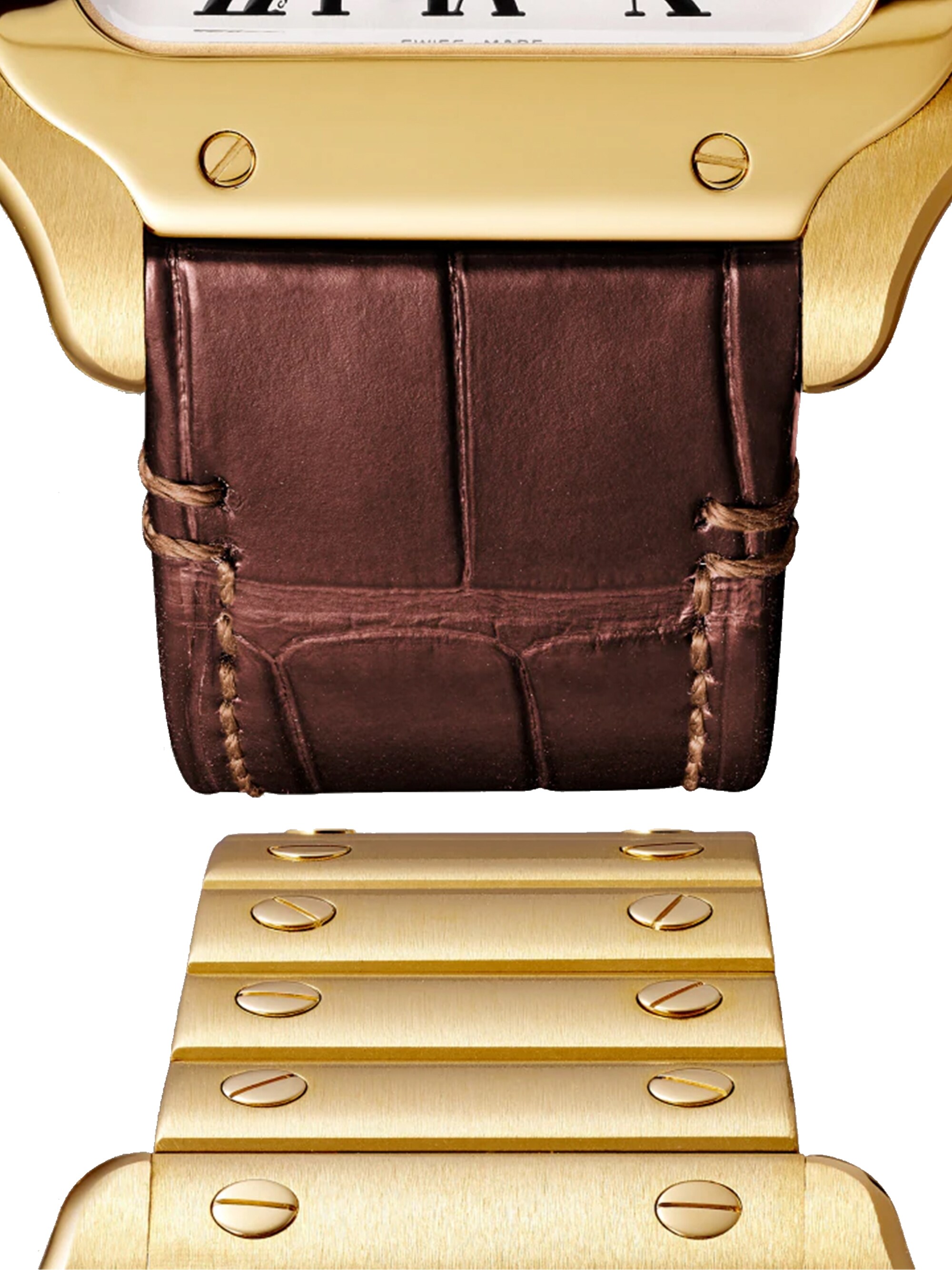 Santos, mittleres Modell, mechanisches Uhrwerk mit Automatikaufzug, Kaliber 1847 MC. Gehäuse aus 750er Gelbgold, Mehrkantaufzugskrone aus 750er Gelbgold mit einem facettierten Saphir besetzt, silberfarbenes Opalin-Zifferblatt, schwertförmige Zeiger aus gebläutem Stahl, Saphirglas. Armband aus 750er Gelbgold mit SmartLink-System zur Längenanpassung. Zweites Armband aus Alligatorleder, austauschbare Doppeltfaltschließe aus 750er Gelbgold. Beide Armbänder sind mit dem QuickSwitch-Armbandwechselsystem ausgestattet. Gehäusebreite: 35,1 mm. Höhe: 8,83 mm. Wasserdicht bis 10 bar.
