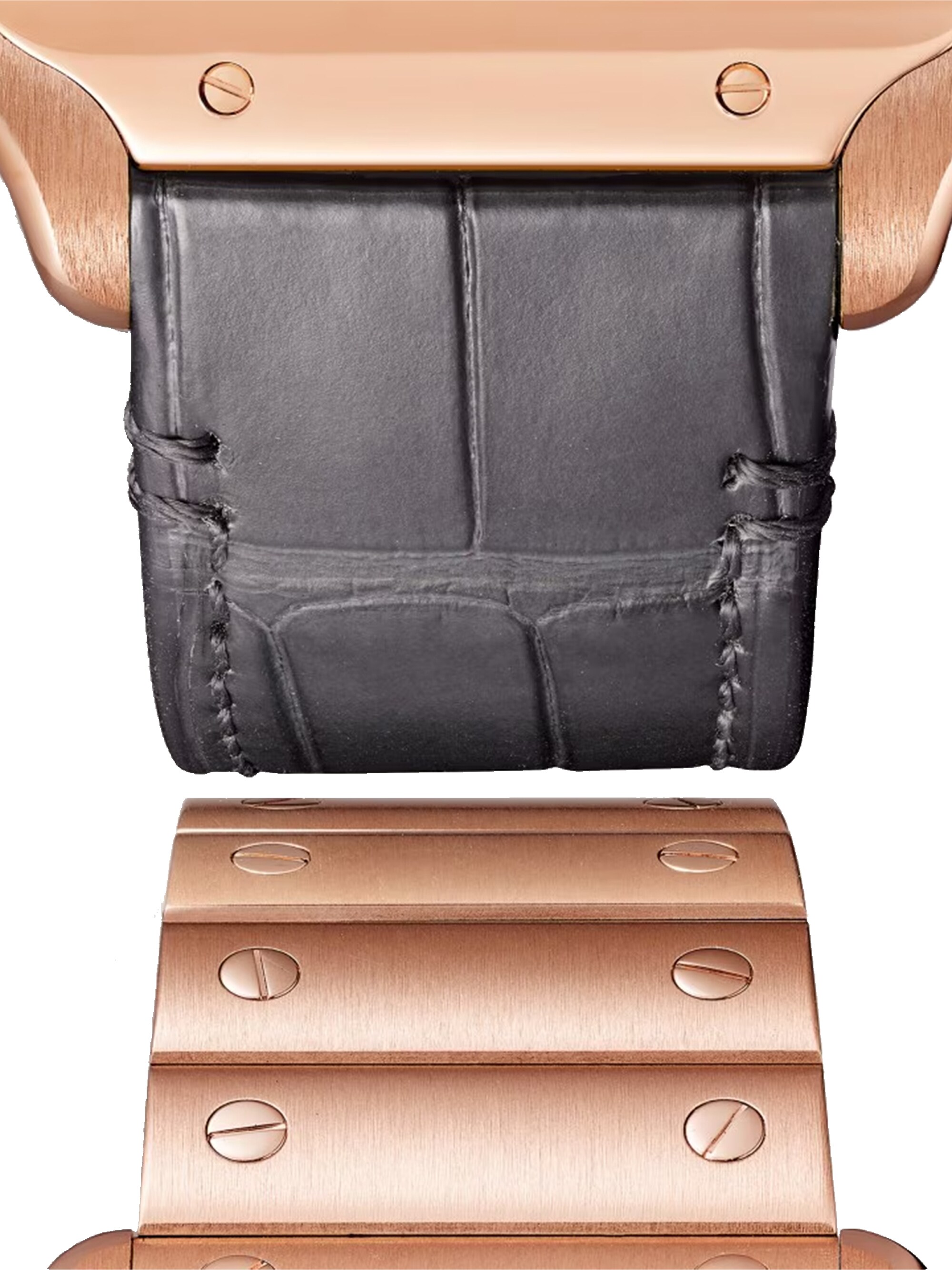 Santos skelettiert, großes Modell, mechanisches Manufaktur-Uhrwerk mit Handaufzug, Kaliber 9619 MC. Gehäuse aus 750er Roségold, Mehrkantaufzugskrone aus 750er Roségold mit einem facettierten Saphir besetzt, schwertförmige Zeiger im Gold-Finish, Glas und Gehäuseboden aus Saphirglas. Armband aus 750er Roségold mit SmartLink-System zur Längenanpassung. Zweites Armband aus Alligatorleder, austauschbare Doppeltfaltschließe aus 750er Roségold. Beide Armbänder sind mit dem QuickSwitch-Armbandwechselsystem ausgestattet. Stunden, Minuten und skelettierte Brücken in Form von römischen Ziffern. Individuell nummeriertes Uhrwerk aus 138 Einzelteilen. Maße des Uhrwerks: 28 mm x 28 mm, Höhe des Uhrwerks: 3,97 mm. Unruh: 28.800 Halbschwingungen/Stunde. Gangreserve: ca. 72 Stunden. Gehäusebreite: 39,7 mm. Höhe: 9,08 mm. Wasserdicht bis zu 10 bar.